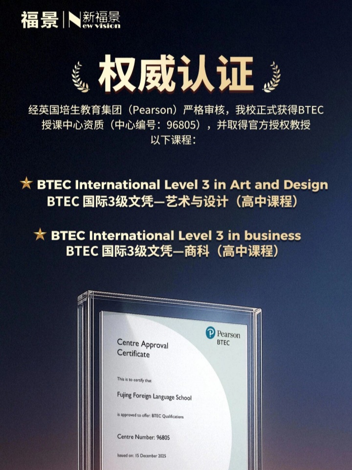 深圳市新福景双语学校 | 权威认证!深圳福景外国语学校获官方BTEC授课中心资质
