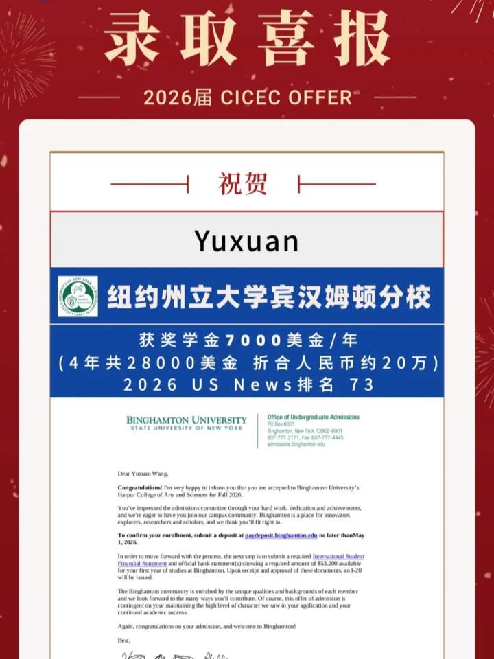 深圳市承翰学校(国际课程实验校区)| 录取喜报 | 奖学金2.8万美金!承翰国际2026届毕业生再获美国名校录取!