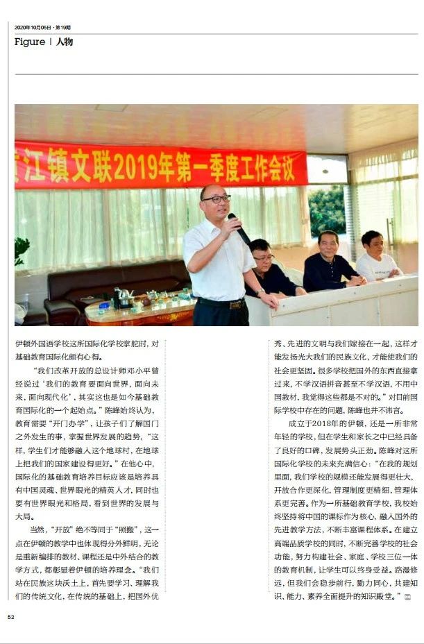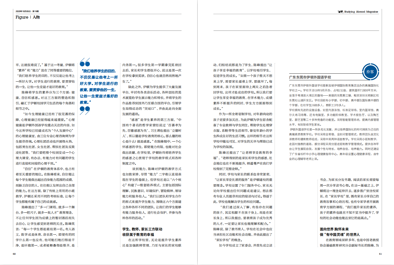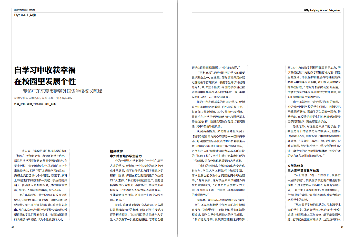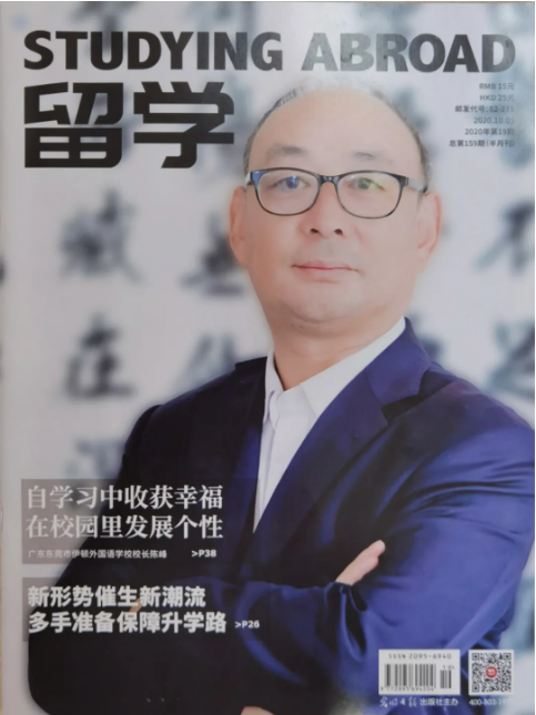 2020年11月5日,2020年第19期(总第159期)《留学》——“人物”专栏特别推荐东莞市伊顿外国语学校陈峰校长作为对话嘉宾,围绕“发挥个性与学有所成”这一核心问题,刊登了题为《自学习中收获幸福,在校园里发展个性》的专访报道。