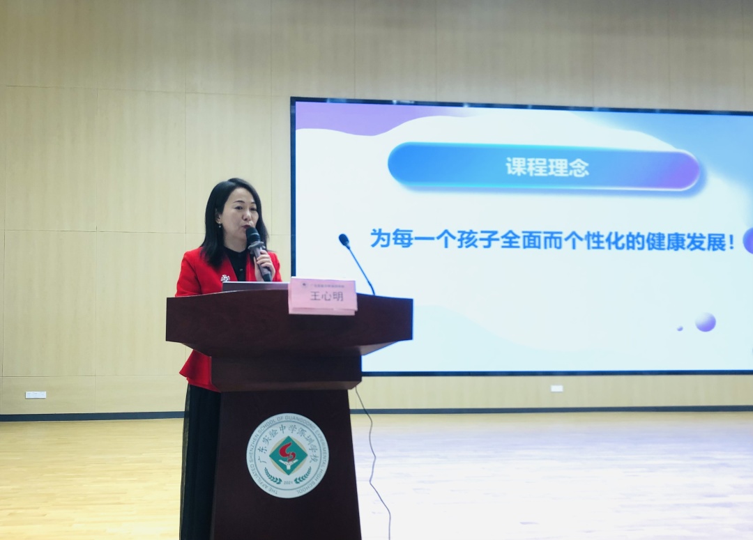 广东实验中学深圳学校学生处王心明老师向所有嘉宾介绍了我校《生涯发展规划》课程理念、课程目标及课程体系,并展示了学校生涯发展规划课程实施的成效。