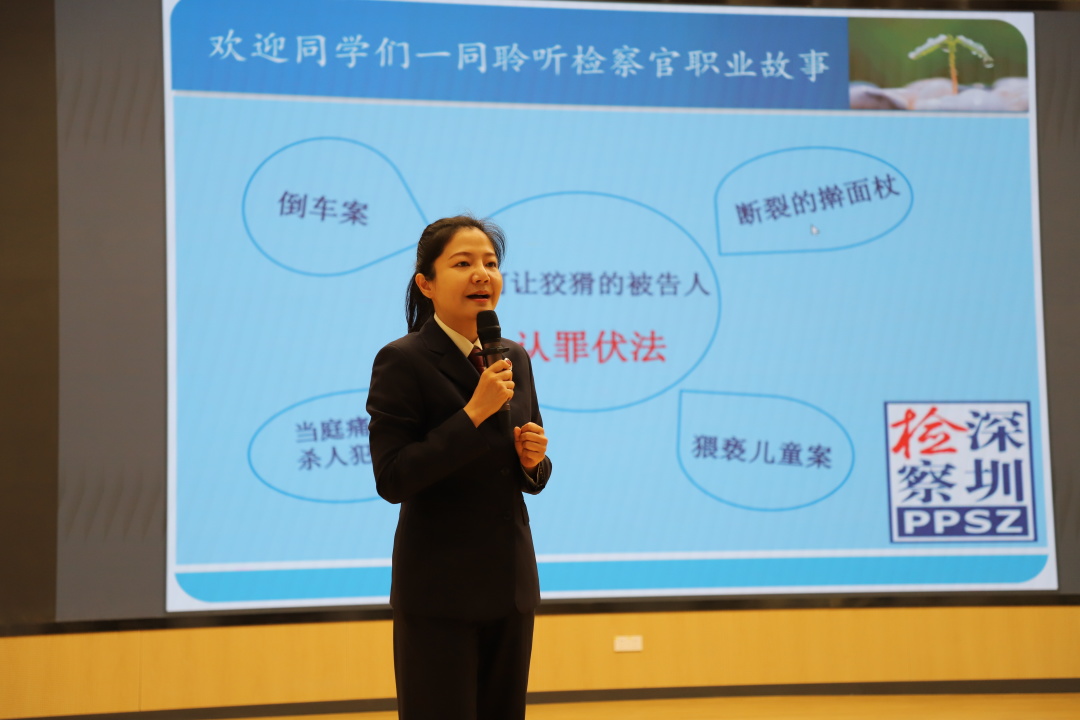 周文静,深圳市人民检查院检察官。周检察官透过一个个鲜活生动的办案故事,引导同学们初步了解检察官是怎样通过证据还原案件事实,如何运用刑法定罪,又是怎样在法庭上指控犯罪。宣讲课上,同学们和检察官积极互动,掌声起伏不断,一问一答中,同学们仿若都已成为一名名小检察官,又或是渐渐在心中埋下知法懂法、学法读法的种子。