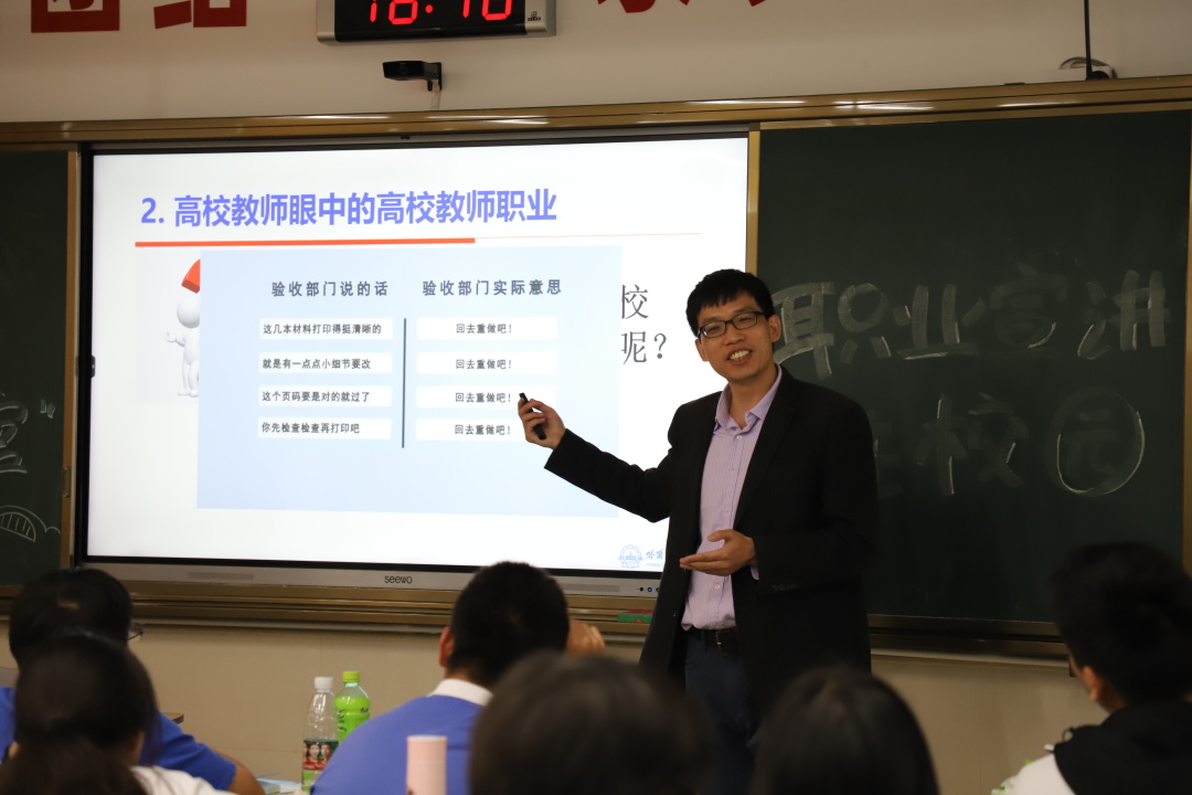 汤步洲,哈尔滨工业大学深圳学校特聘研究员/副教授、博士生导师。汤教授以“浅谈高校教师职业”为主题,向同学们分享了不同人眼中的高校教师职业、高校教师的责任与使命以及如何才能成为高校教师。汤教授以现身说法,用生动的讲述、活泼的表达、丰富的实例为同学们揭开了高校教师这一职业的神秘面纱。高校教师是一份育人的工作,理想信念、兴趣爱好则是这份工作的核心,汤教授由此向同学们讲述了高校教师应当承担的责任与使命。
