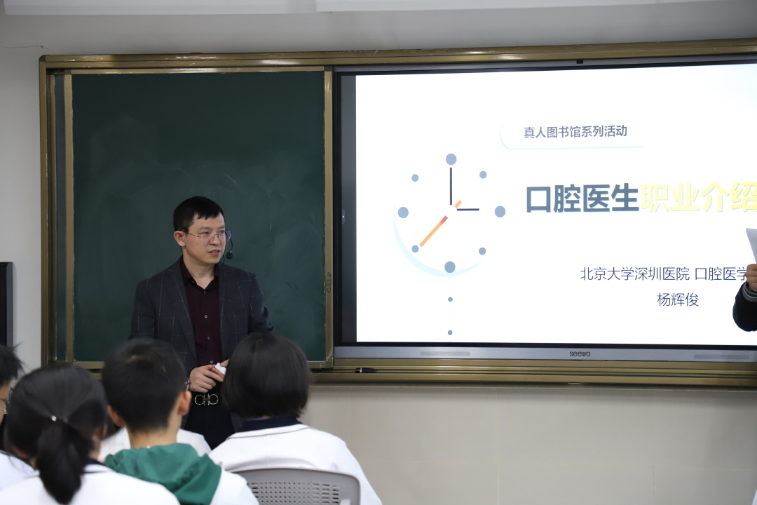 杨辉俊,北京大学深圳医院口腔医学中心主任医师。杨医生从7个方面,分别是:职业概述、学科定位、口腔医生职责、口腔医生培养制度、职业要求与职业路径、口腔医学的社会环境与职业机会评估、国内口腔医学院校推荐,给有志于成为一名医生的与会同学做了一场精彩的报告。学生全神贯注,紧紧跟着杨医生的节奏,全面地了解了口腔医生这一职业。