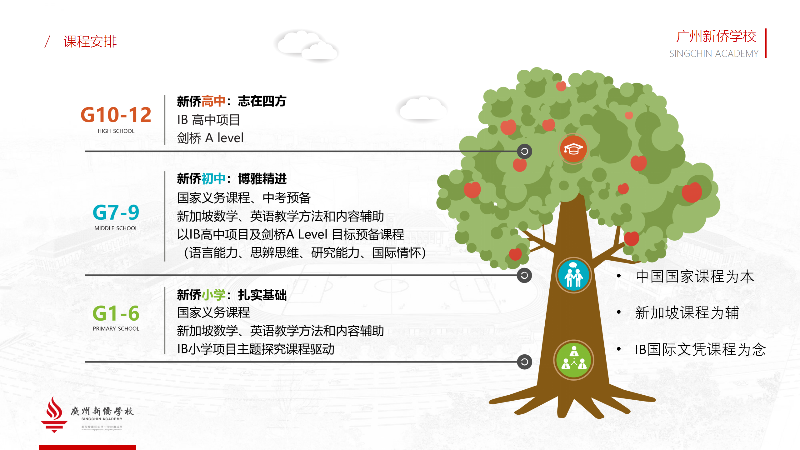 在课程方面,以中国国家课程为本,以新加坡课程为辅,以IB国际文凭课程为理念,形成广州新侨学校独有的融合课程体系。