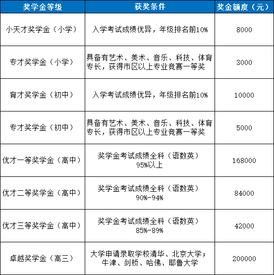 学校奖学金评审委员会将对每位申请人资料和入学测试成绩进行审核,评选出各年级各项奖项人员,并于开学后进行公示。