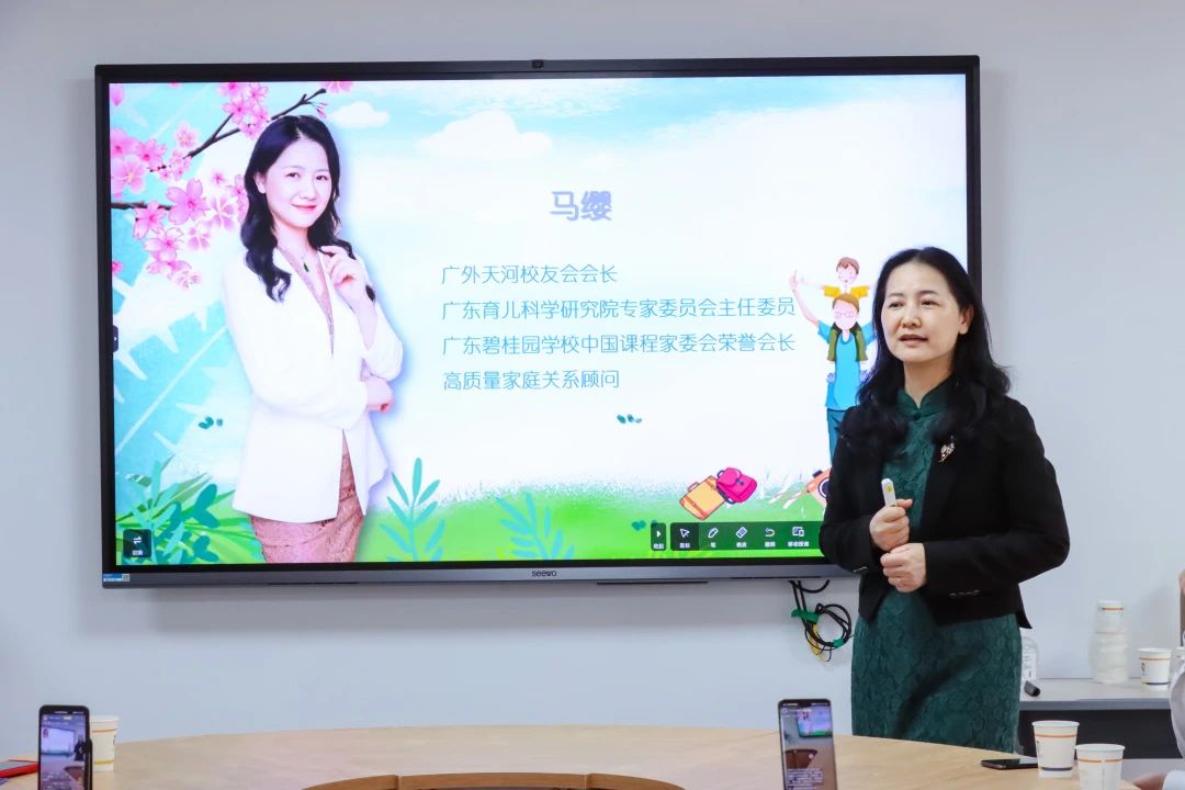 广外天河校友会会长、广东育儿科学研究院专家委员会主任委员马缨女士作为本次主题分享会的嘉宾之一,她以“妈妈是孩子生命里的一束光”为主题,给大家分享了她与女儿莎莎的成长故事,马会长将她的育儿心得娓娓道来。从安全感、情绪管理、家校合作等方面叙述她在孩子成长过程中施加的魔法,让孩子健康快乐成长。