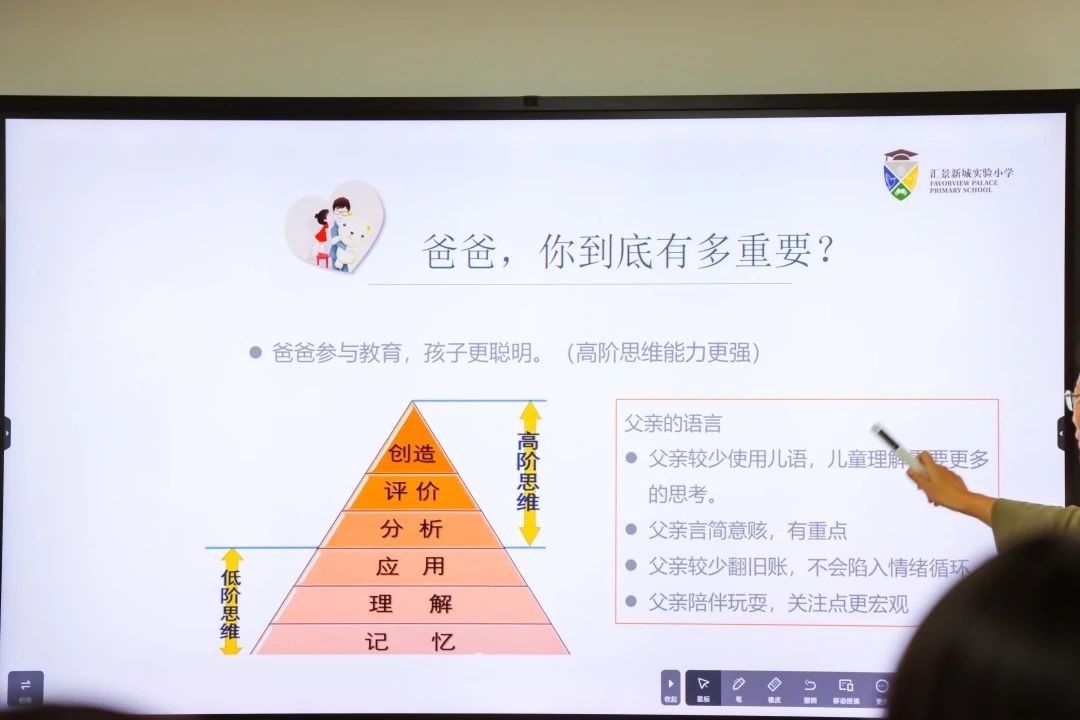 汇景新城实验小学徐无名校长则给大家分享了讲给爸爸听的育儿课,她说到:陪伴孩子成长不仅是妈妈的事情,父亲在运动能力、探索能力、视野的开拓等方面,对孩子的智商、情商都有更大的影响,父亲的角色在家庭教育中的远比我们想象中更重要。