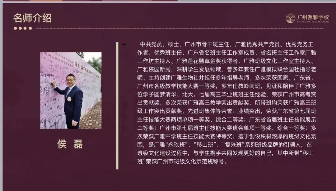 侯磊老师是广州市朱穗清名班主任工作室成员、广雅中学班级文化研究工作室主持人。他不但有深厚的理论高度,又有丰富的实践经验,对班级文化建设有着独到而有效的方法。