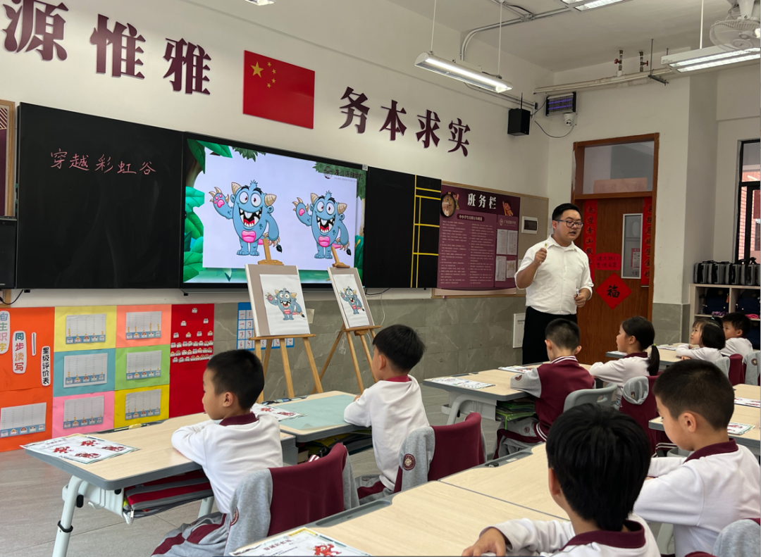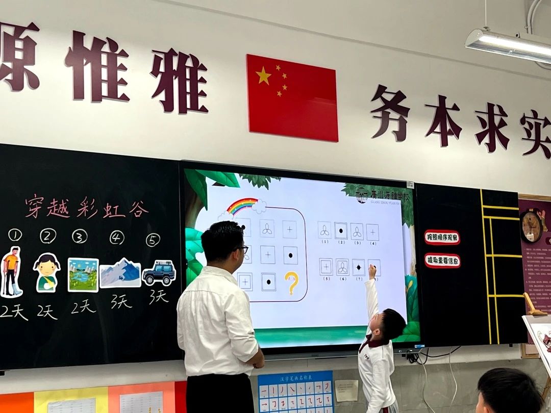 严雨琦老师带领102班的孩子们给大家展示了《穿越彩虹谷》这一课。严老师深入挖掘教材,借助三个游戏关卡层层推进,创设了趣味性极高的学习情景,引导孩子们在猜想、验证、证明过程中展开有意义的学习探究,从中不断提升自身的认知能力。