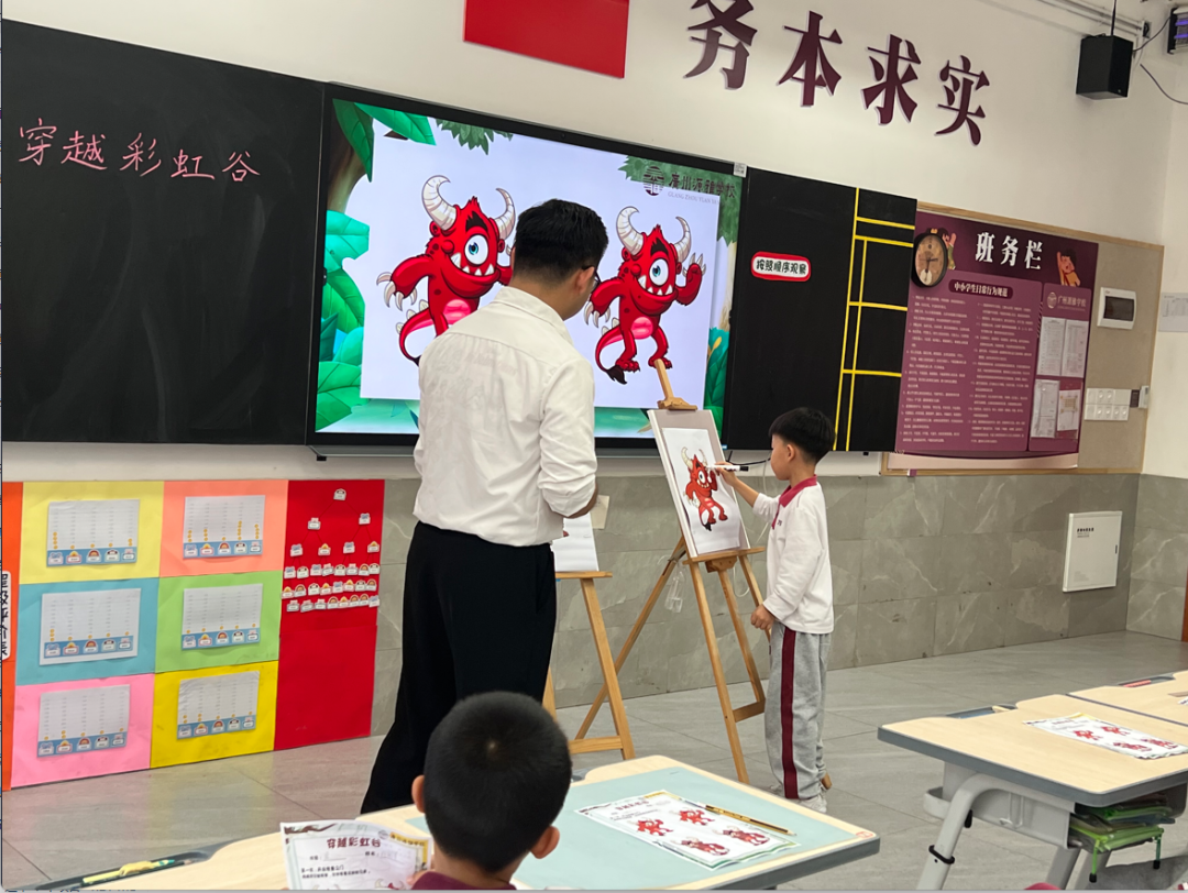 课堂中专家李冰教研员亲自指导孩子们“探索彩虹谷”,孩子们积极展示自己的学习成果,沉浸在闯关成功的喜悦当中。