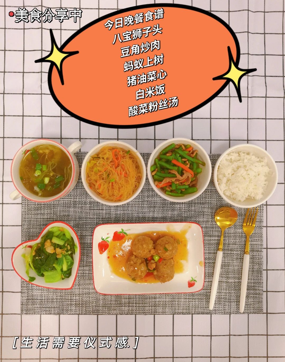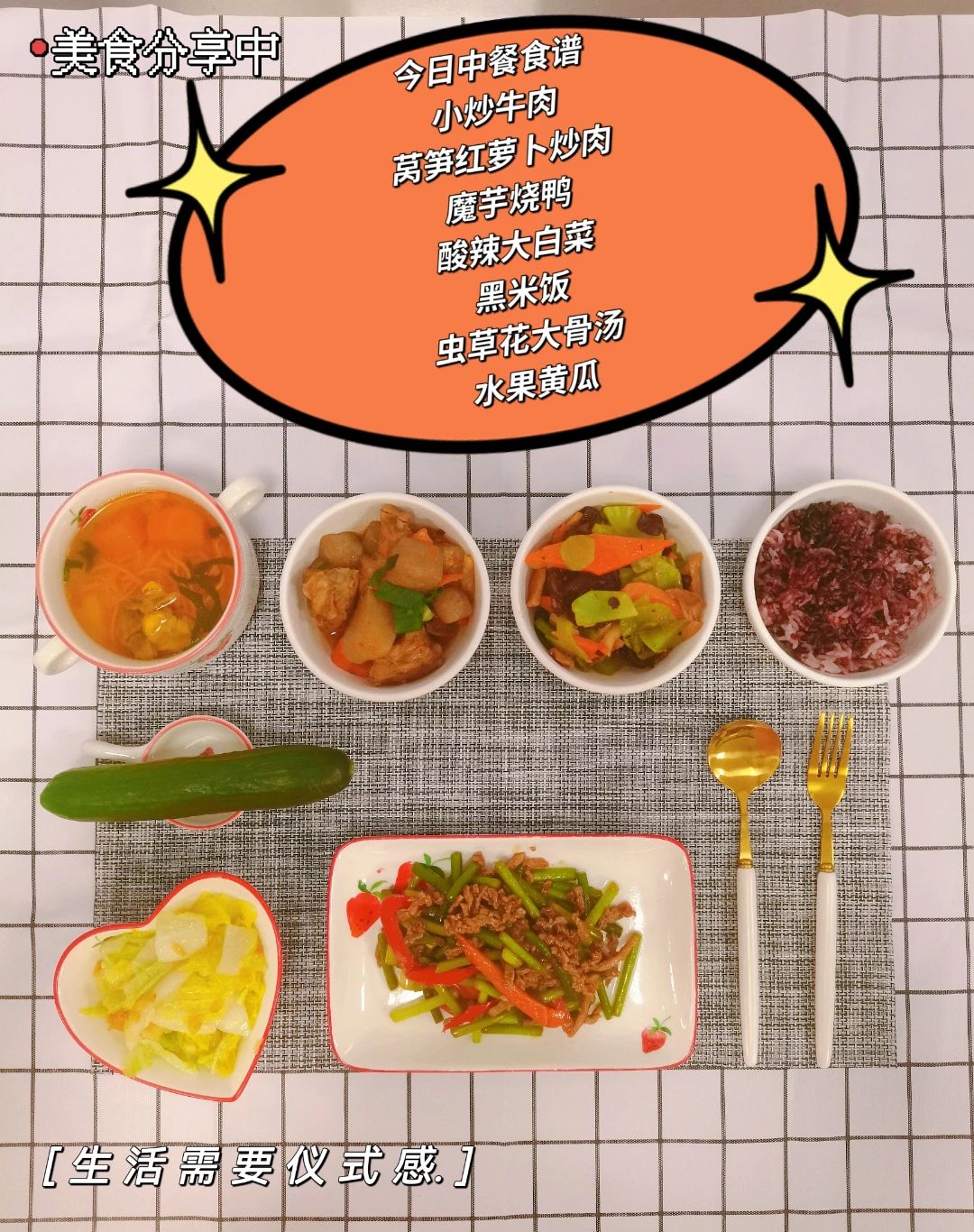 京酱肉丝、油淋肉沫茄子、蒜心炒腊味、酸辣大白菜、白米饭、菠菜瘦肉汤