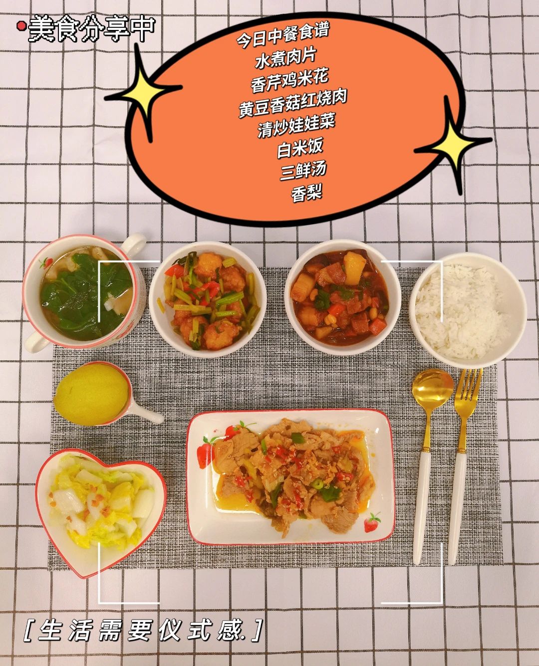 红烧肉、香芹木须炒肉、三鲜水蛋、蒜蓉生菜、白米饭、芥菜肉片汤