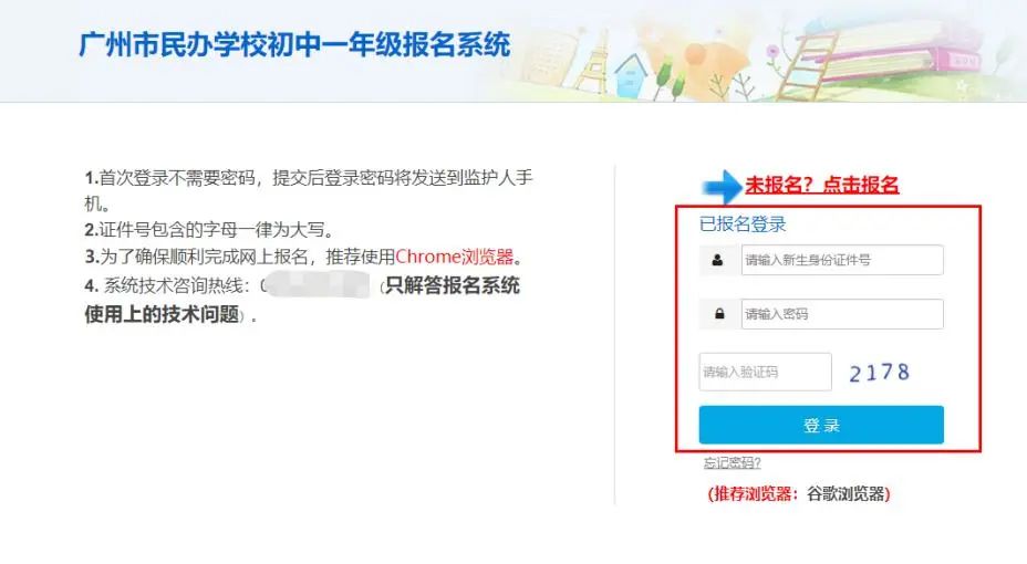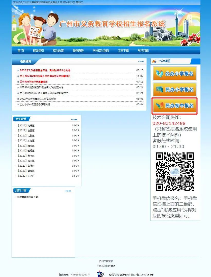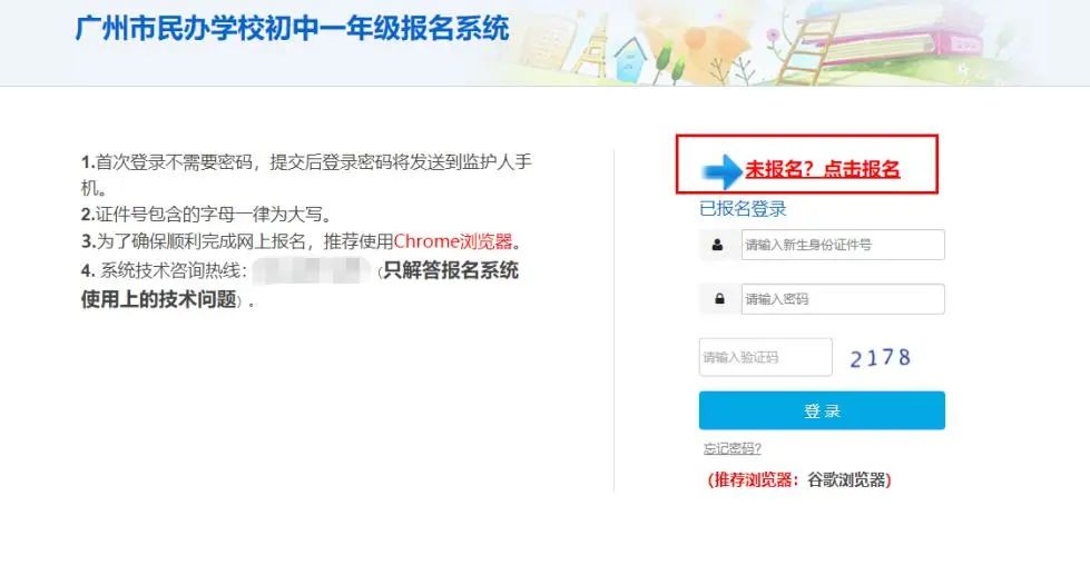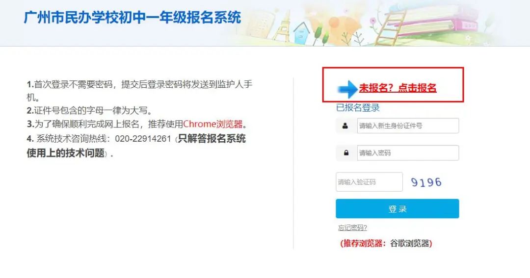 用谷歌浏览器(推荐使用)登录广州市义务教育学校招生报名系统,并点击右侧“民办初中报名”按钮。