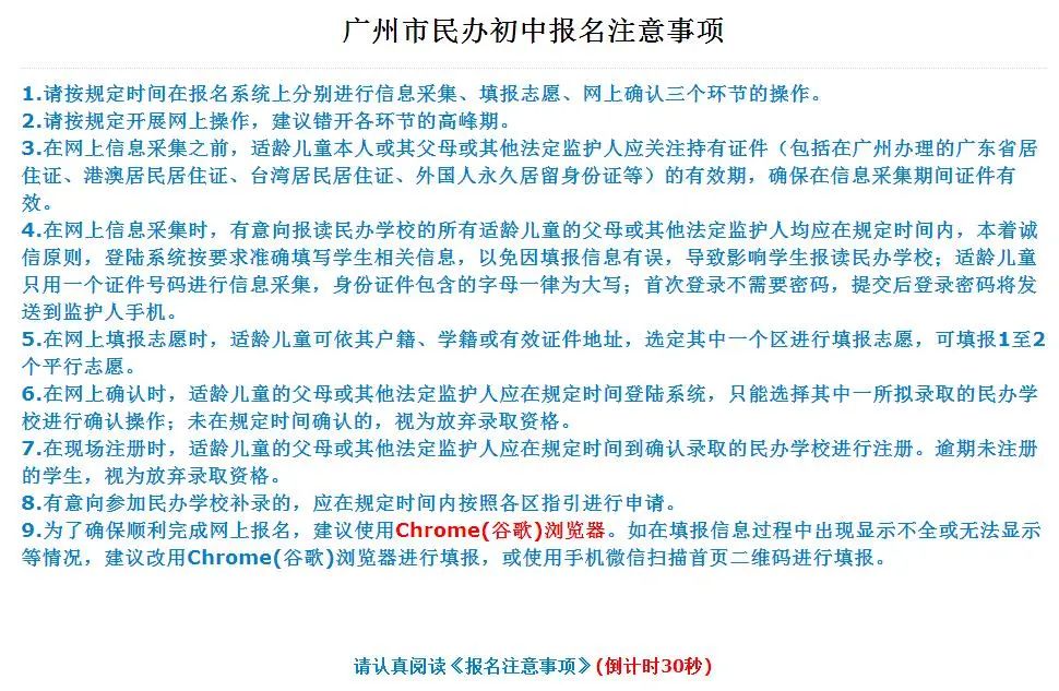 (一)进入【民办初中报名】后弹出【报名须知】,认真阅读30 秒后可点击“我已认真阅读《报名注意事项》”,勾选进入下一步开始报名。