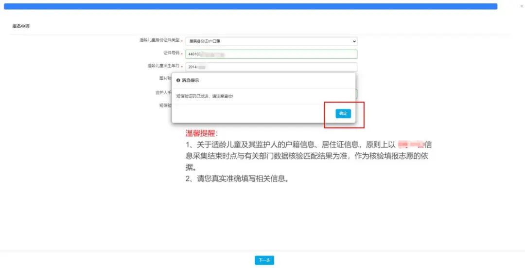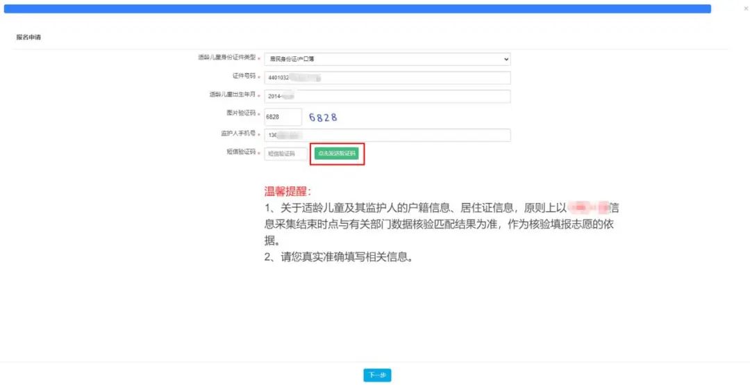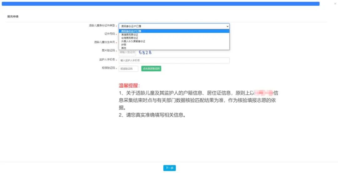 (三)按适龄儿童实际情况填写证件类型及号码、图片验证码,输入监护人手机号码。收取短信验证码后正确填写验证码信息进入下一步的填报资料。