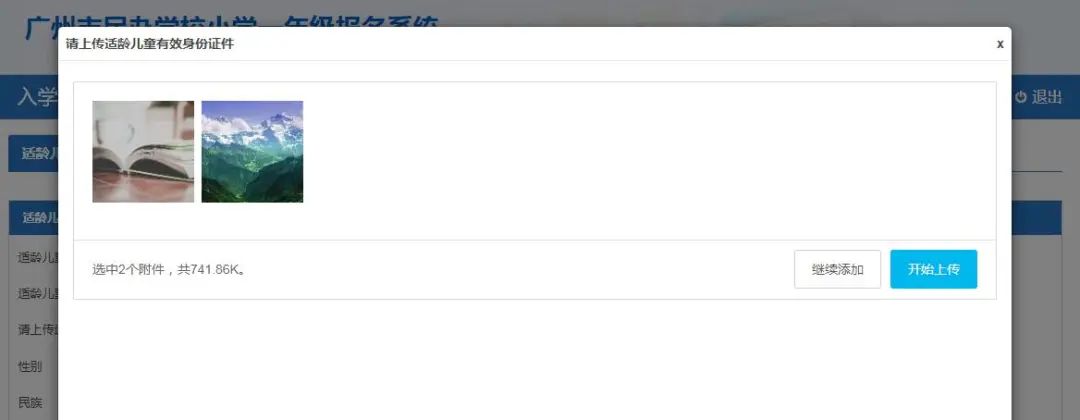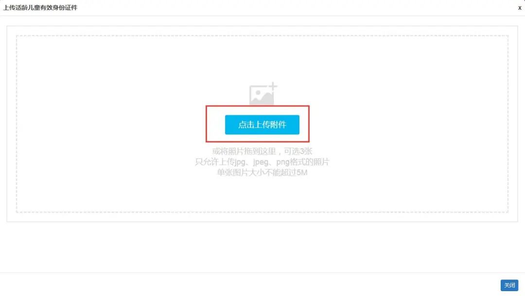 (2)适龄儿童如使用外国人永久居留身份证、护照或其他证件登记的,需要上传相关能证明其身份或居住地所在区的资料。(注意:可扫描或拍照上传,最多可上传3 张附件,附件类型只允许上传jpg、jpeg 和png 格式的图片,单张图片大小不能超过5M)
