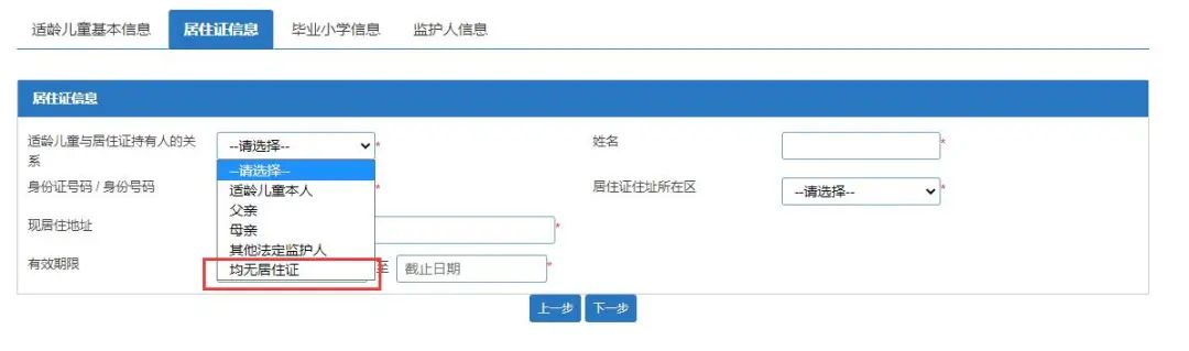 (注意:如适龄儿童及其监护人均无居住证,“适龄儿童与居住证持有人的关系”请选择“均无居住证”,选择后居住证信息为非必填。)