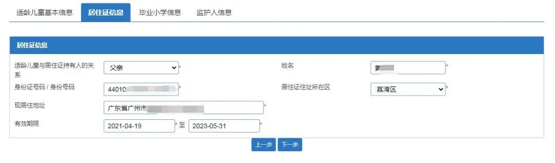 (二)【居住证信息】:输入适龄儿童与居住证持有人的关系、持有人身份证号码及其他相关信息。