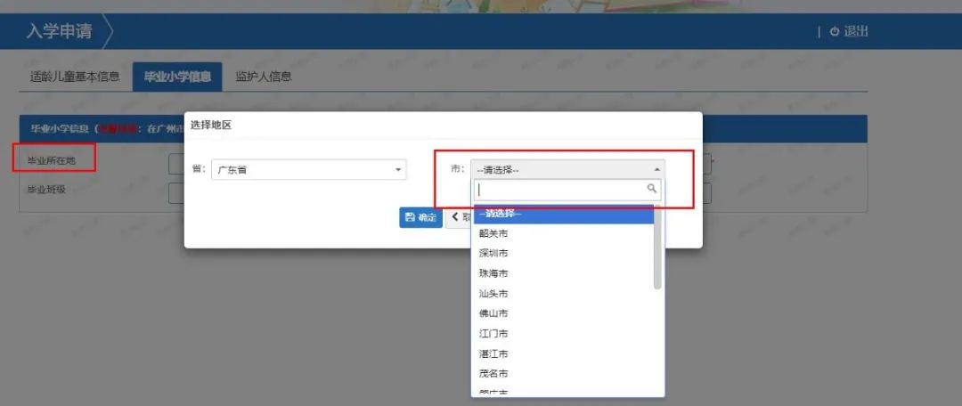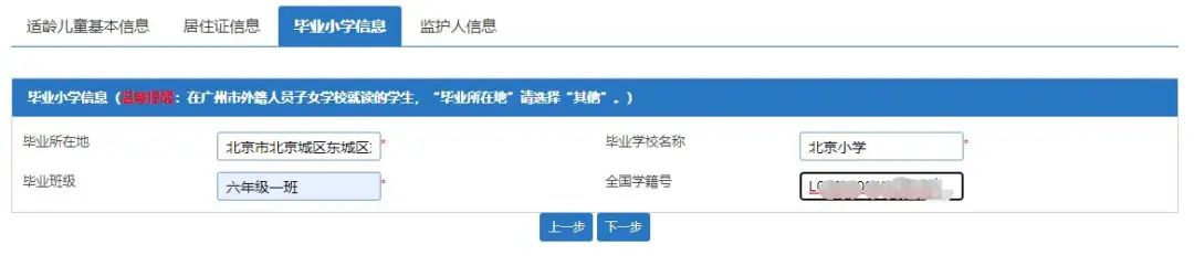 1、如新生小学毕业所在地为广州市,则无需手动输入毕业小学信息,系统将会自动匹配毕业小学信息。