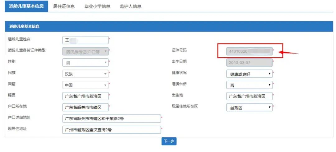 3、新生小学毕业所在地为广州市,系统没有自动匹配信息且“毕业所在地”无法选择“广州市”,说明现填报的证件号码与广州市学籍系统(广州市教育综合管理系统)里面所登记的证件号码不一致。家长需要咨询学校并用对应的证件号码重新返回首页进行报名。