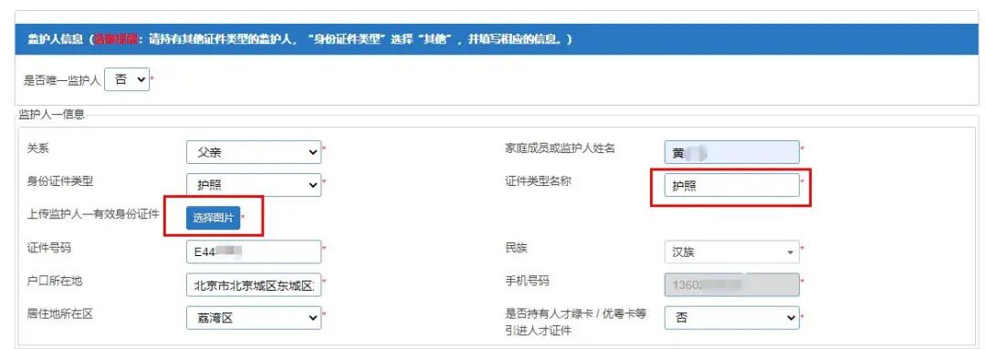 2、身份证件类型选择了非“居民身份证/户口薄”时,则需要上传监护人有效身份证件并填写证件类型名称。