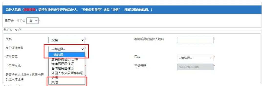 1、请持有其他证件类型的监护人,“身份证类型”选择“其他”,并填写相关的信息。