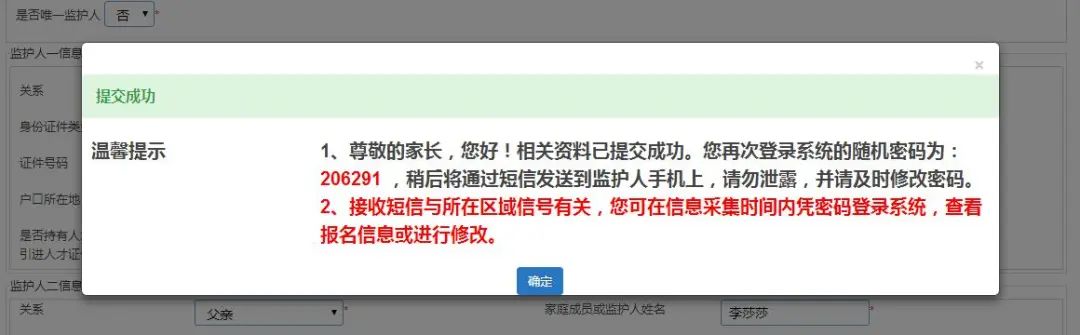 (五)【完成信息填报】:请家长确认所填信息是否无误,如确认信息无误,请点击“确认”。提交成功后系统将向监护人手机发送随机密码的短信。家长可凭此短信密码重新登录系统查看资料及完成其他相关操作。