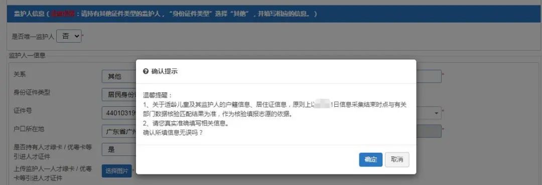 (四)【监护人信息】:家长填写监护人信息,包括适龄儿童与监护人关系、监护人详细资料等。
