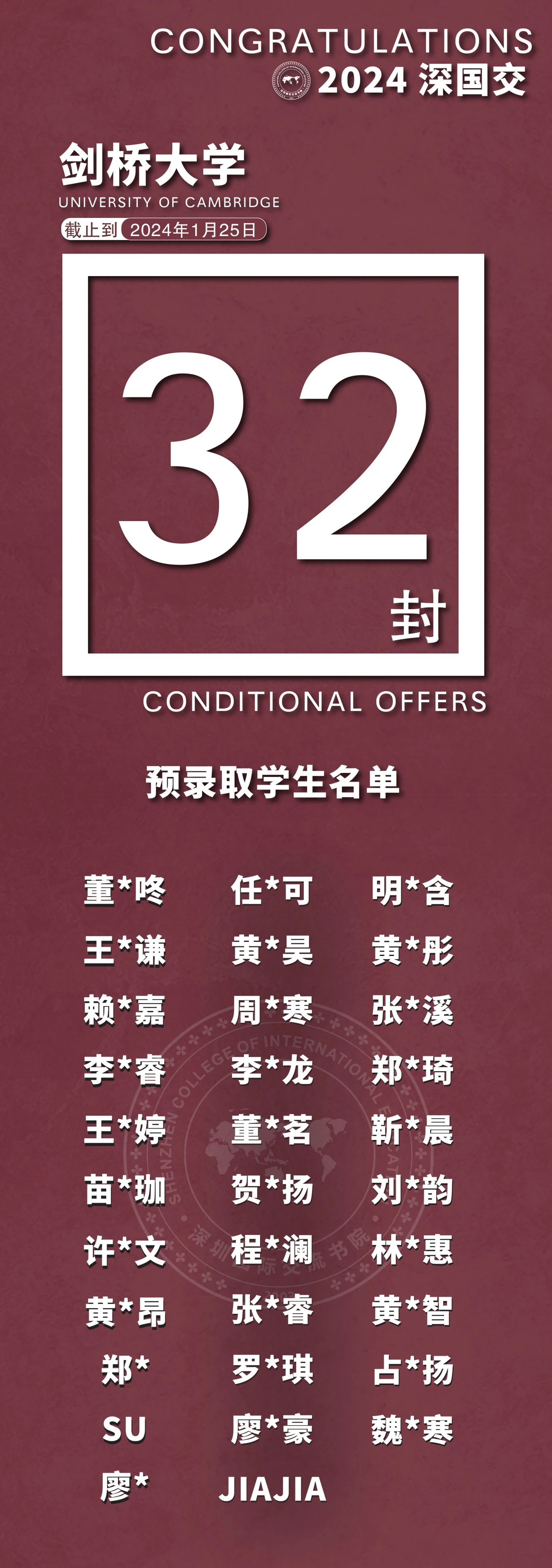 2024年1月24日剑桥大学开始放榜,截至目前,深圳国际交流书院2024届毕业生中,有32位同学获剑桥大学预录取。加上此前的16位同学已获得牛津大学预录取通知书,深圳国际交流书院2024年喜获48枚牛津、剑桥预录取通知书。