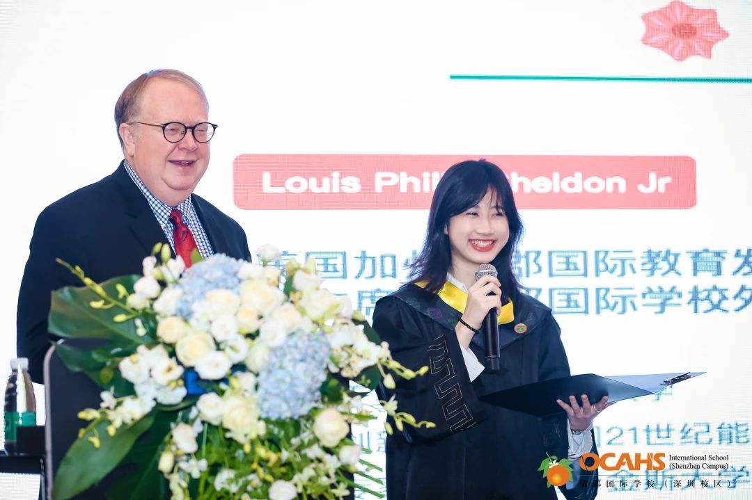 Louis Jr. Sheldon先生、橘郡国际学校中国总校校长左阳博士、家长代表陈上贵先生与学校全体教师、毕业生及亲友共同出席见证。