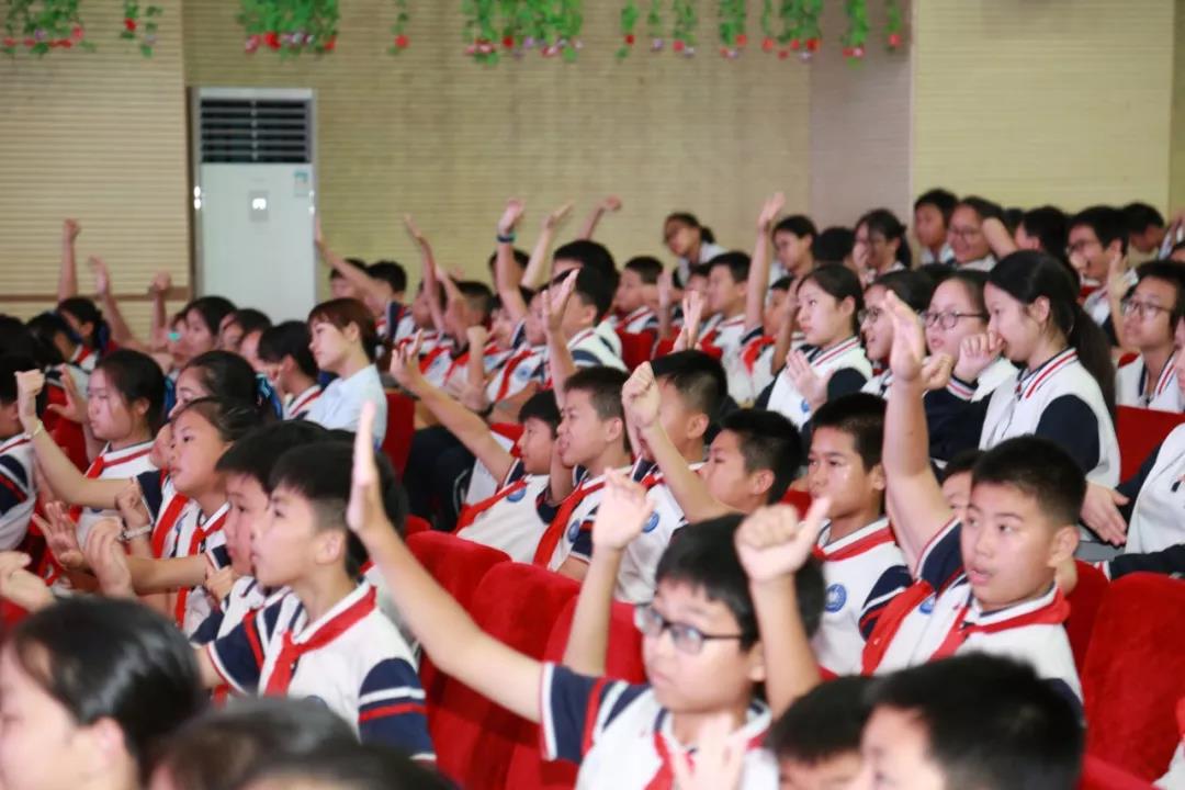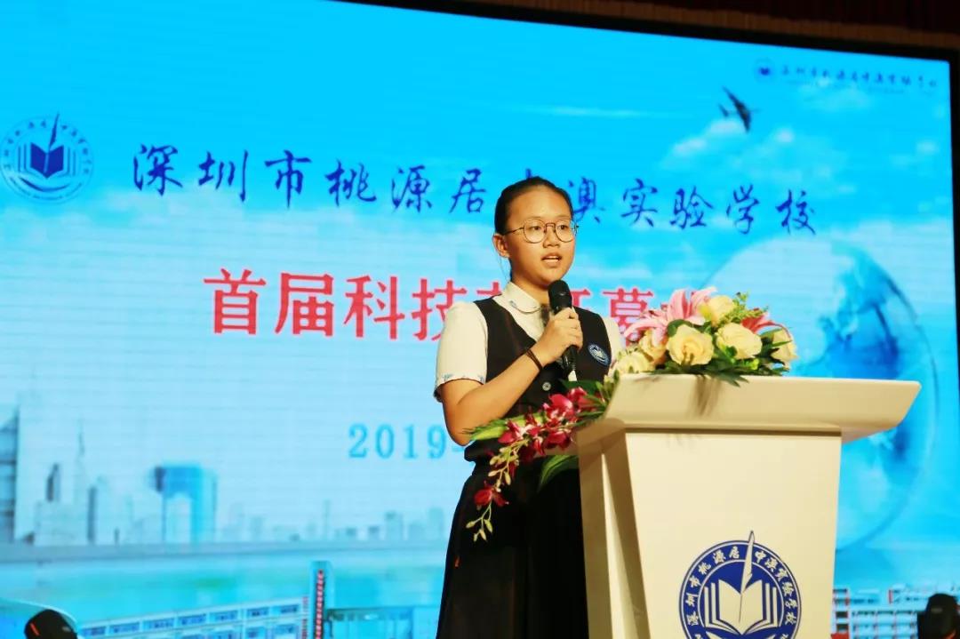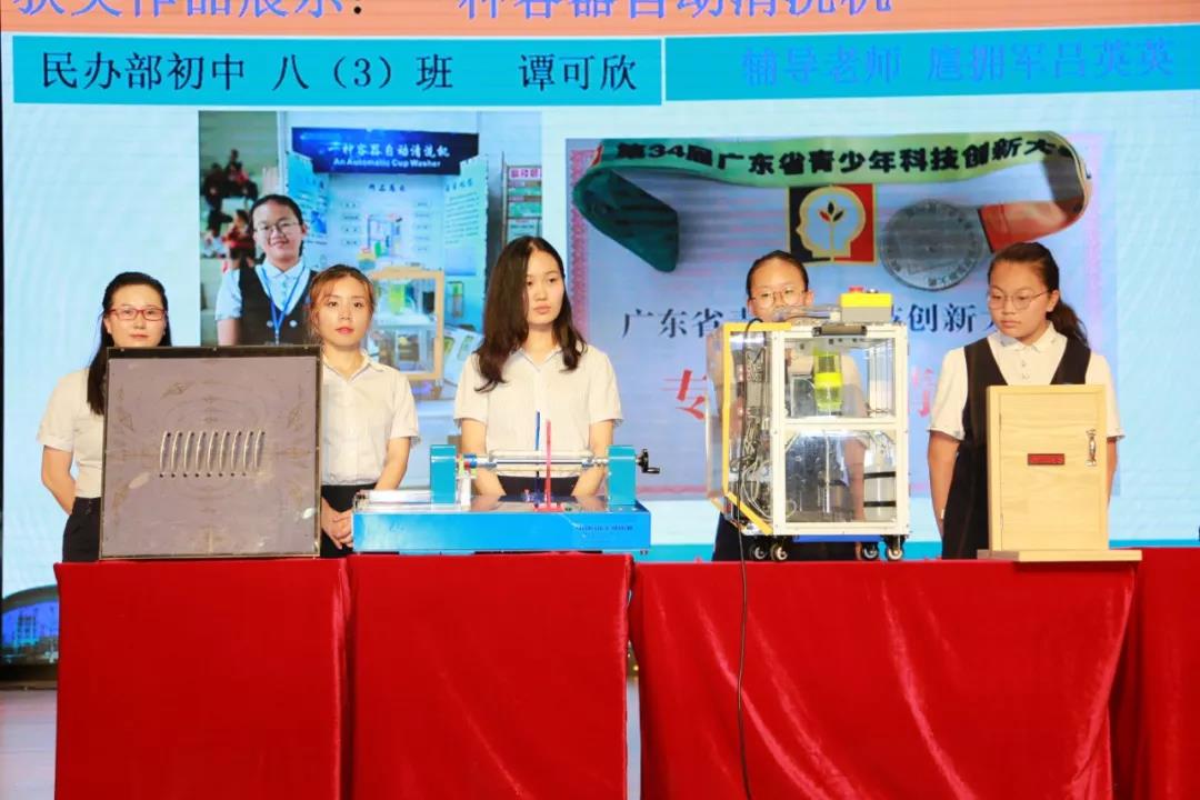 在第34届广东省青少年科技创新大赛获得两项大奖的谭可欣同学作为学生代表发言,表示在这次发明创新的过程中,提升了思维、开拓了视野,获益匪浅。她衷心感谢学校提供的展示舞台,感谢学校领导及老师的帮助,感谢爸爸妈妈的支持和理解。