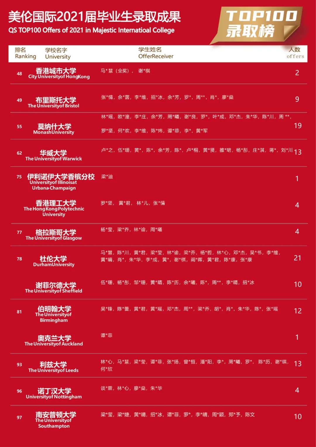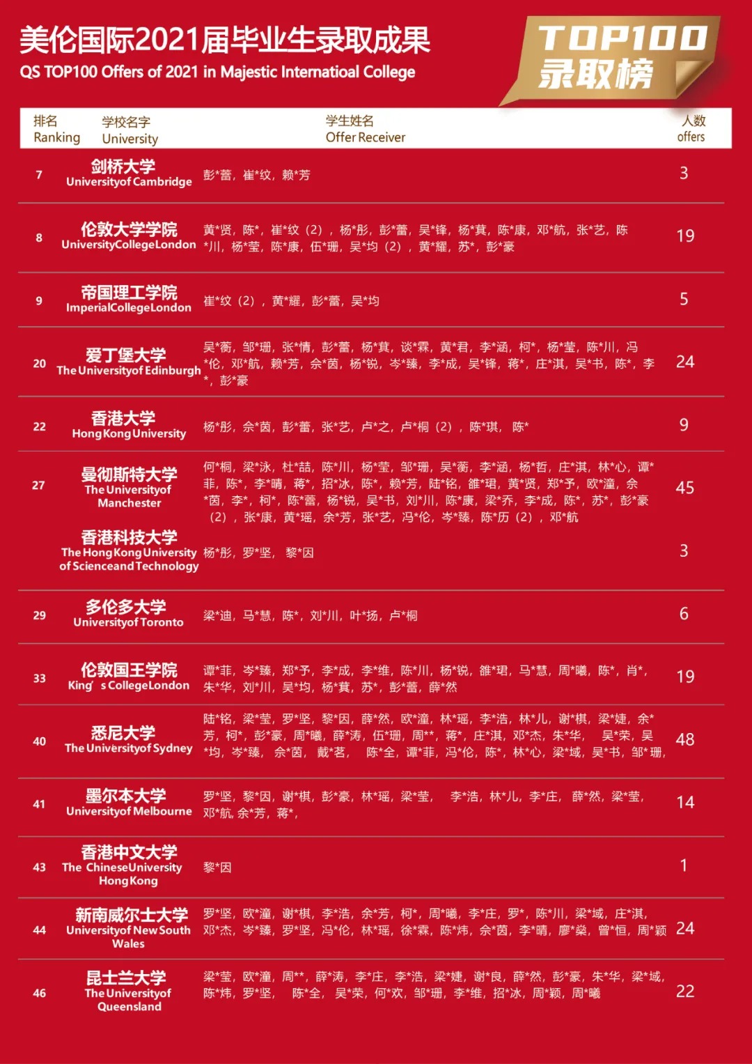 美伦国际2021年毕业生世界TOP 100大学录取成果