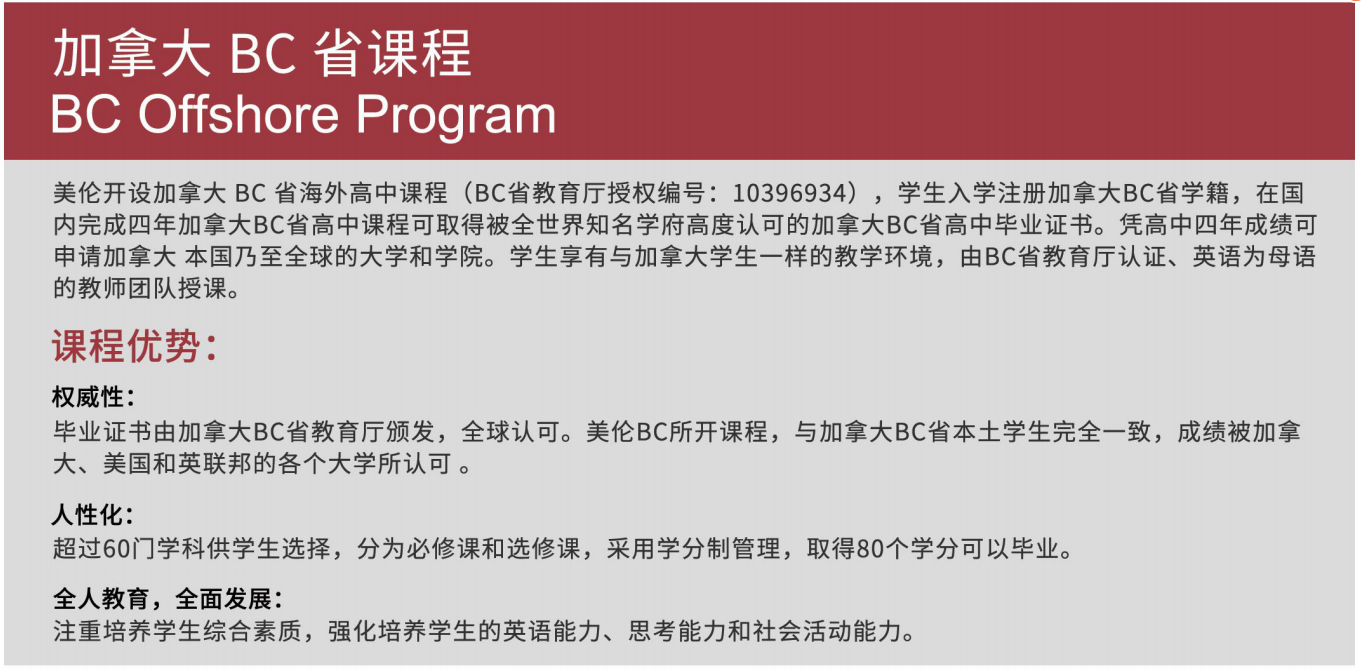 美伦BC课程介绍(想了解更多,请点击图片)美伦开设加拿大BC省海外高中课程(BC省教育厅授权编号:10396934),学生入学注册加拿大BC省学籍,在国内完成四年加拿大BC省高中课程可取得被全世界知名学府高度认可的加拿大BC省高中毕业证书。凭高中四年成绩可申请加拿大本国乃至全球的大学和学院。