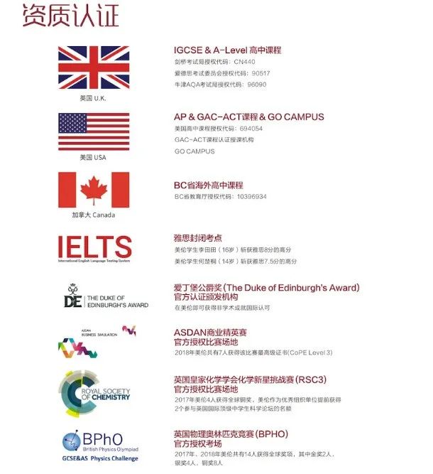 学校开设了英国高中课程(IGCSE&A-Level)、加拿大BC省高中课程等国际课程,是广东省一所加拿大BC省离岸高中,英国剑桥和爱德思两大考试局的授权课程学校和考点学校,美国AP课程授权学校,雅思考点,各类国际学科竞赛考点。实行20-25人的小班制的个性化教学,确保教师与每个学生有充分的交流机会,更好的将学习落至实处,发挥教学优势。