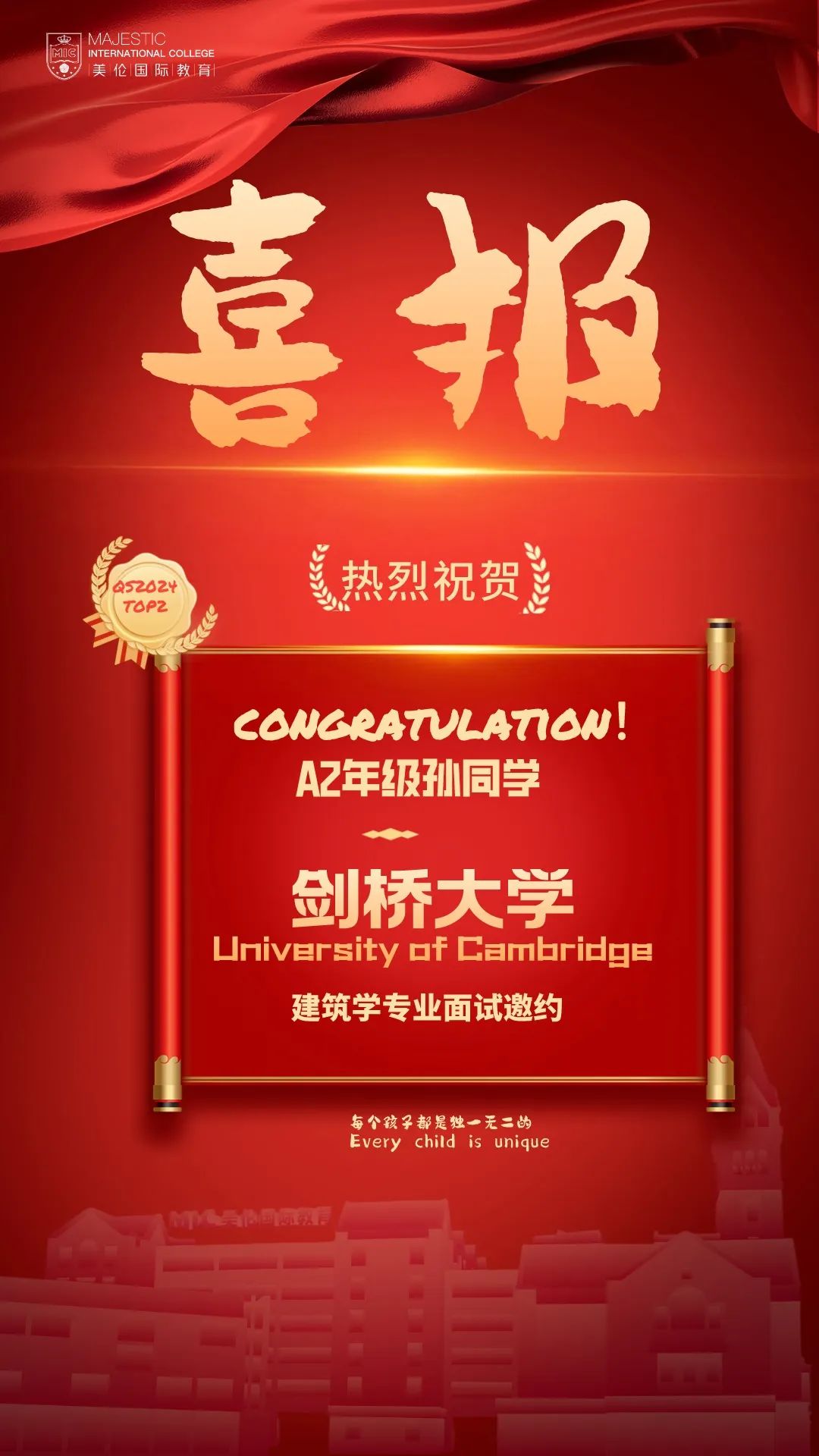 剑桥大学是全球顶尖大学之一,在2024年QS世界大学排名中,位列第2名;也是英国G5(英文又称the G5 group或the G5 super elite)精英大学中之一,其面试邀约率仅占申请者的20%,可见其对申请者选拔之严格。而美伦孙同学就拿到了建筑学专业的面邀,恭喜孙同学!