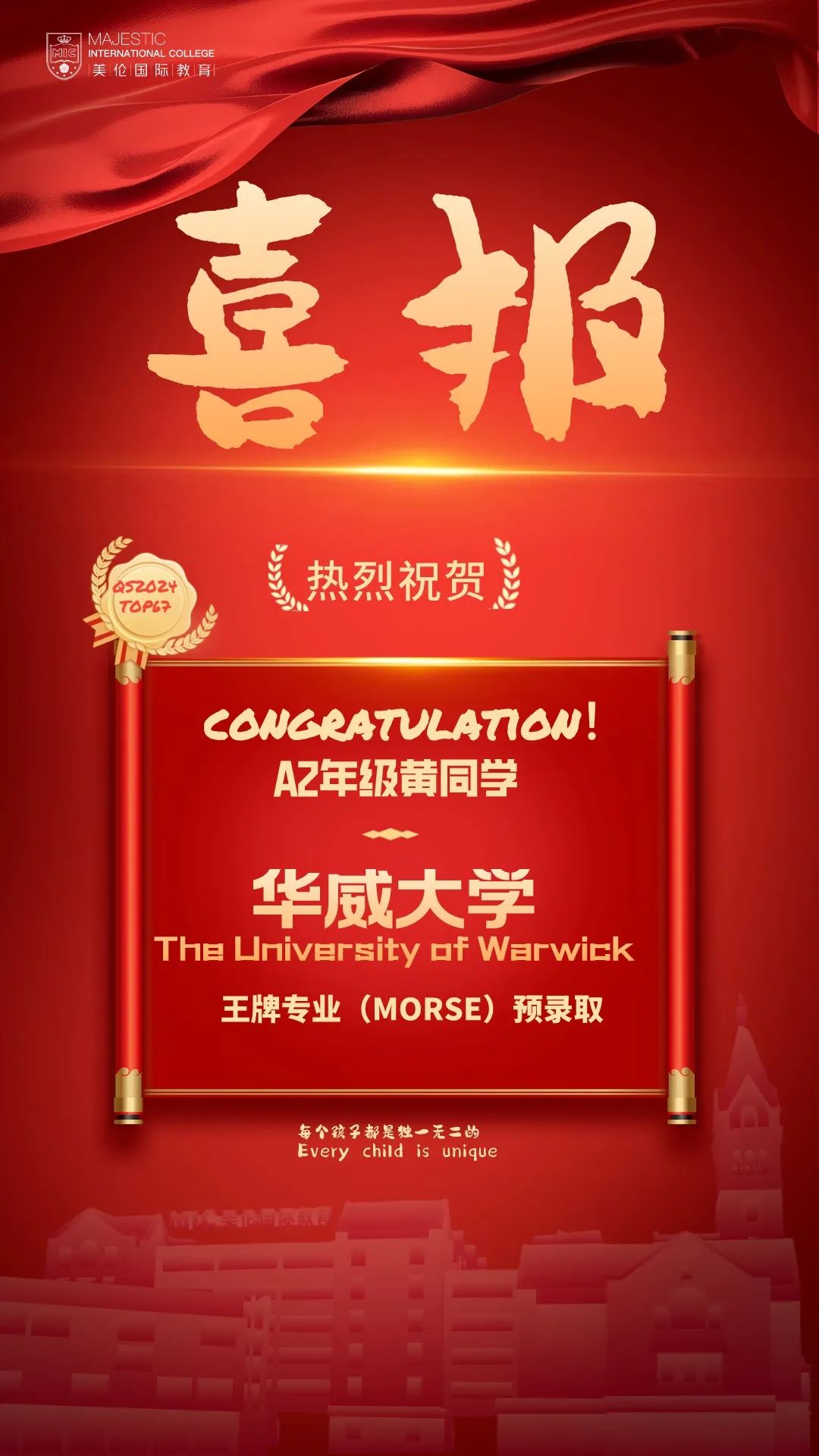 华威大学,世界百强名校,英国顶尖研究型大学,英国常春藤联盟罗素大学集团成员。MORSE(Mathematics,Operational Research, Statistics and Economics)即数学、运筹学、统计学和商学也是其学校的王牌专业,而华威大学也是全世界唯一提供该专业的大学,可见竞争激烈,恭喜美伦黄同学获得该大学的offer!