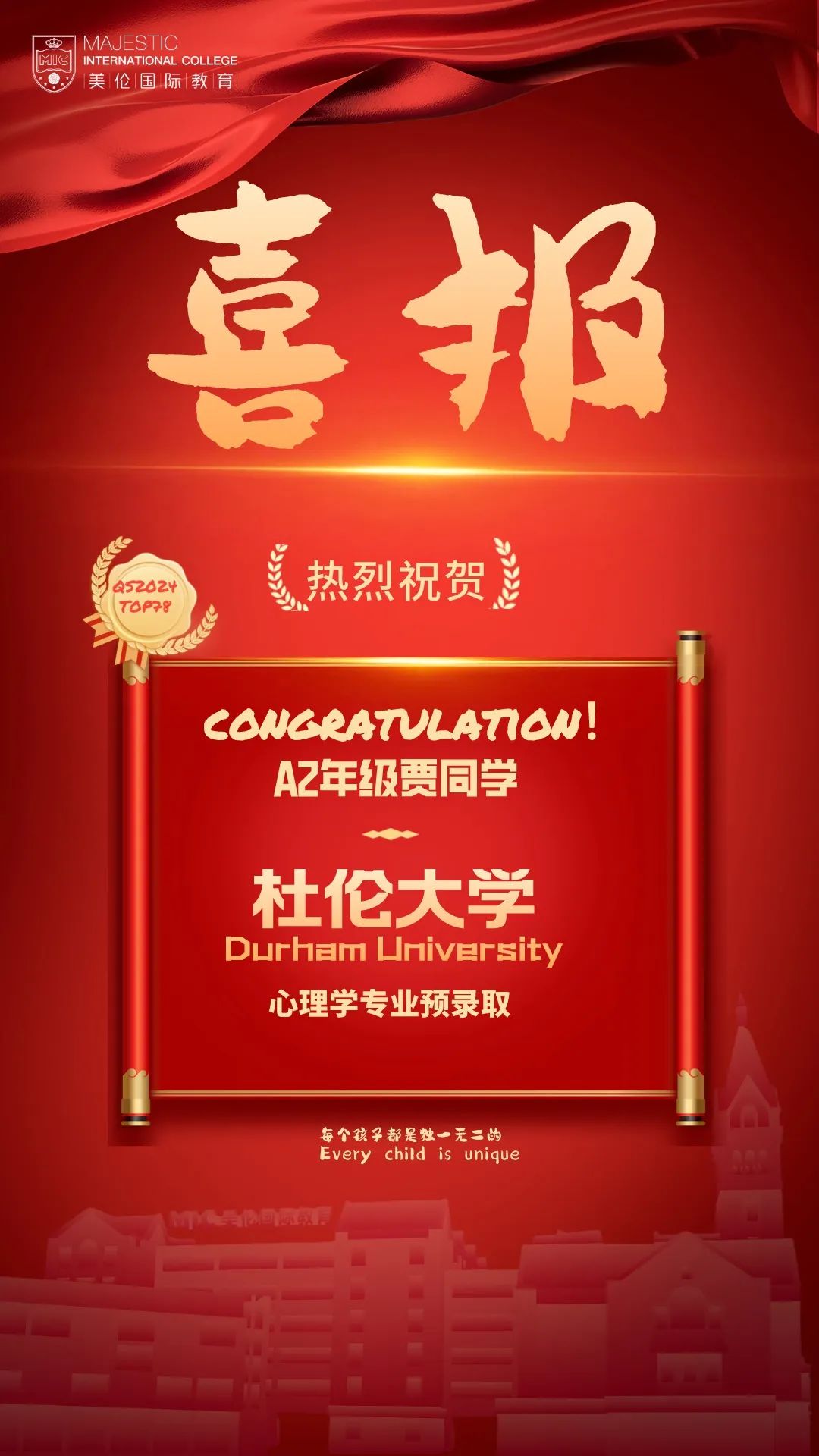 杜伦大学,坐落于英国杜伦,世界著名研究型大学 ,英国常春藤联盟罗素大学集团成员。杜伦大学是一所学院制的大学。该校的学院是寄宿制学院,为学生参加社会与学术活动提供了极佳的场所。祝贺贾同学获得中国学生极少申请的心理学专业offer!