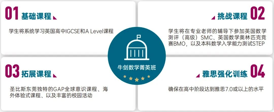牛剑数学菁英班是由剑桥大学校友、英国圣比斯公学校董王德志先生带队并亲自执教的特制课程,依托圣比斯(东莞)丰富的教学资源及升学经验,为有潜质的学生打开通向牛津、剑桥大学的大门!