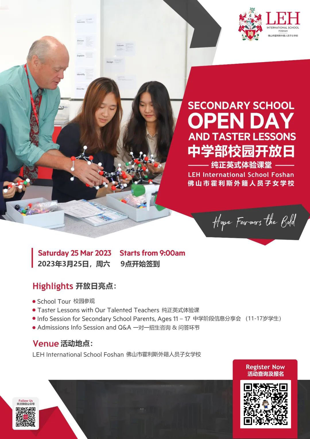 参加佛山市霍利斯外籍人员子女学校LEH3月25日中学部开放日,体验英式教育特色