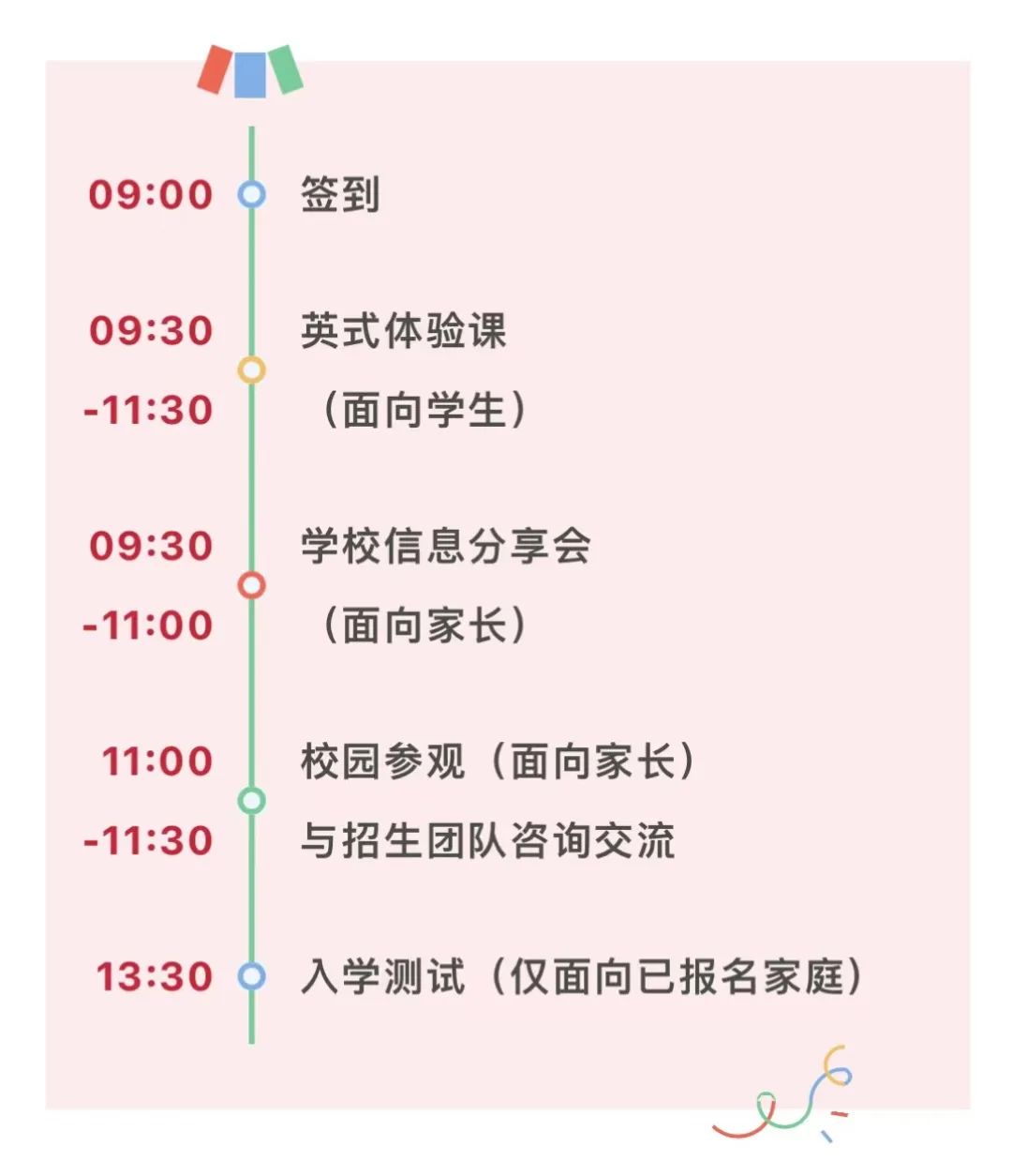 5下午入学测试(仅面向已报名家庭):13:30 – 17:00