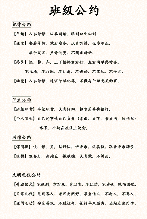 全校各班学生自主制定班级公约,学生代表和教师代表讨论制定年级公约,并且在年级学生大会上进行解读,作为年级评比的标准。