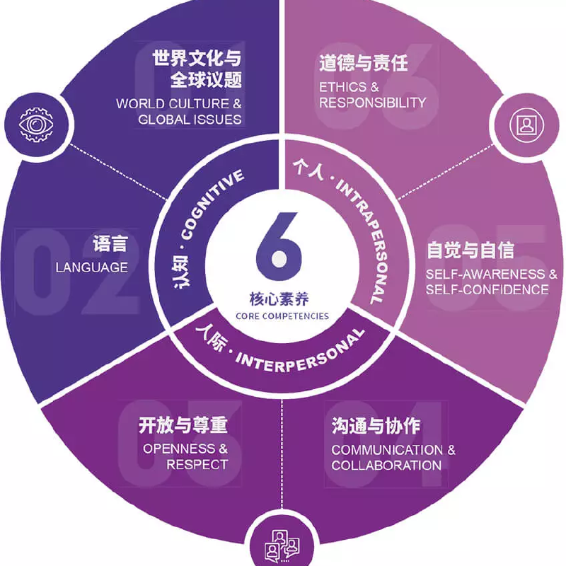浸润式人文语言环境培养学生具有国际视野和跨文化交流能力,使学生成长为一个更加强大与包容的学习者和“双语沟通者”。深厚中国人文底蕴、灵动的跨文化沟通能力、追求卓越和开物创新的国际复合型人才。