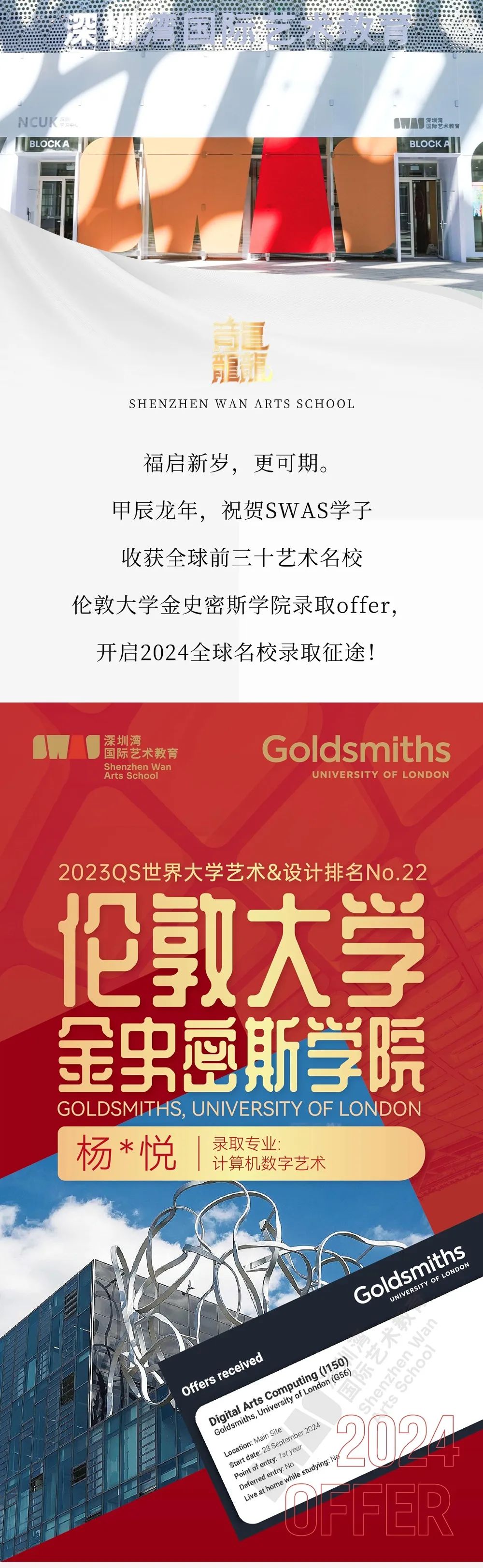 深圳湾国际艺术教育SWAS丨SWAS学子获伦敦大学金史密斯学院录取offer!
