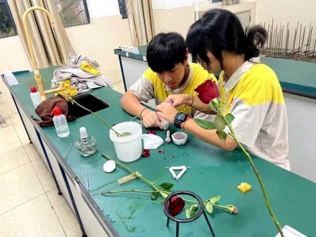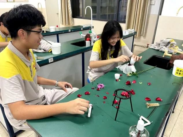 学生们在老师的引导下尝试用天然的玫瑰花提取精油并与蜂蜡等材料混合,将其转化为独特的“实验室制口红”。