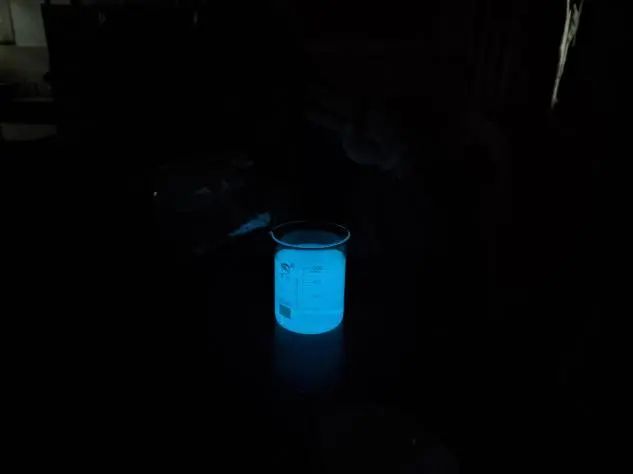 眼前,鲁米诺溶液与酸性物质产生反应,在黑暗闪烁着神奇的荧光。这一实验让学生们了解到广泛应用于刑事侦查、生物工程、化学示踪等领域的鲁米诺原理,进一步激发学生们对“化学如何应用于现实不同领域”的探究热情。