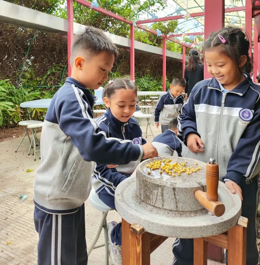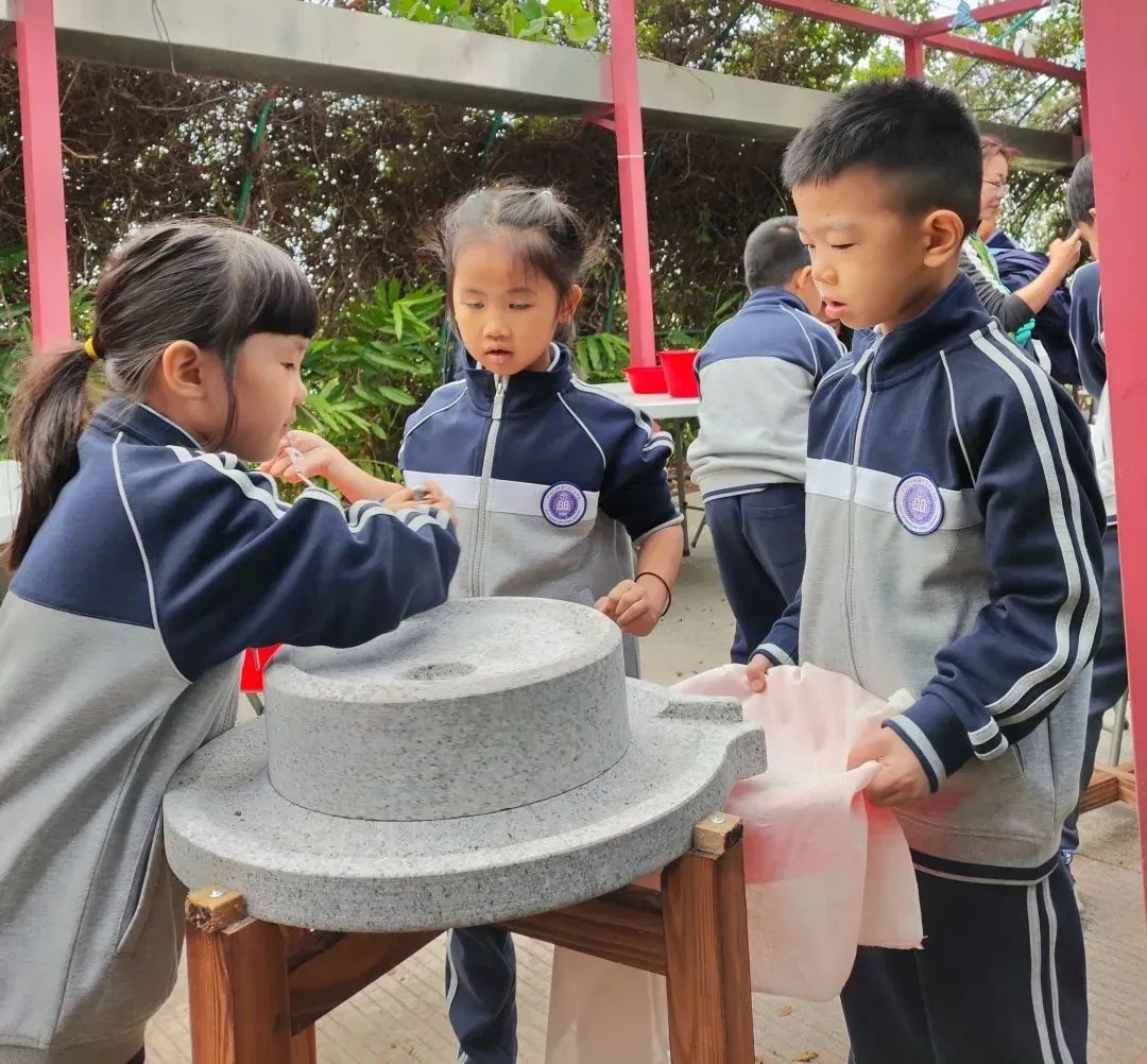 另一边,小学的小可爱们在老师的带领下轮番上阵,在小小的石墨上大显身手,与小伙伴们携手,互帮互助共同制作石磨豆浆。原来自己用石磨磨出的豆浆,真的会更加细嫩、柔滑、清香呢!古法石磨豆浆体验课让孩子学会细心观察、动手探索、劳动实践,学会与伙伴协同互助,感受通过劳动付出获得食物的乐趣。拉近了距离,一起度过冬日里的美好时光。