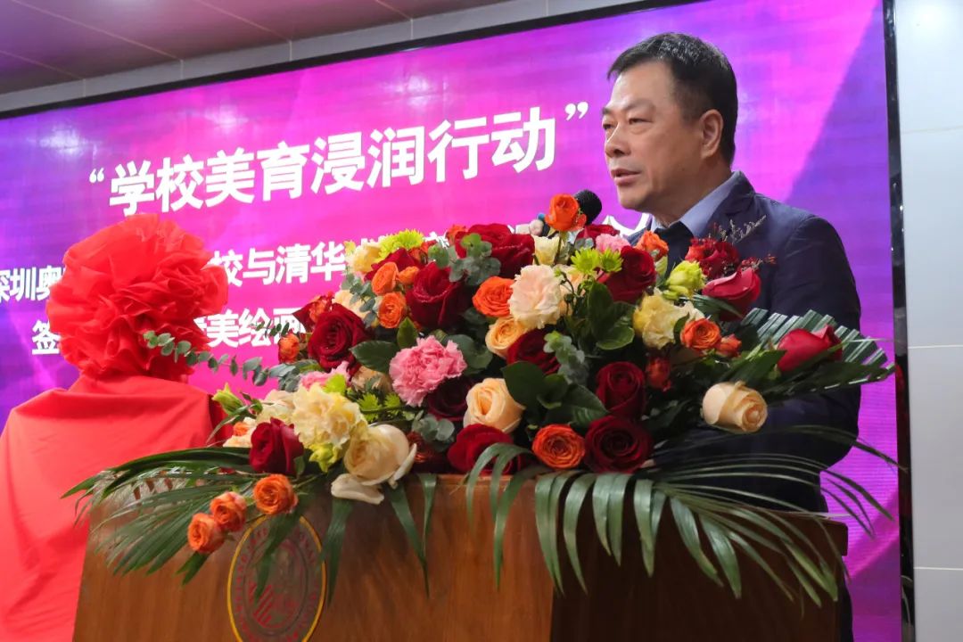 罗湖区教育局副局长刘维志为此次启动仪式致辞,他表示,此次奥斯翰外语学校与清华大学美术学院《深港一体化背景下的美育教学体系探究》课题研究挂牌、奥斯翰外语学校成为清华大学美育课题合作研究实践基地,是罗湖区教育教学工作的一件大事,同时也是学校办学历史上迈出的重要一步。相信在清华大学美术学院专家组的指导下,用课题研究提升教育境界,用课题研究引领指导教育实践,将开创出具有奥斯翰外语学校特色的学生素质发展的评价改革新局面,为大湾区教育发展起到模范示范作用。