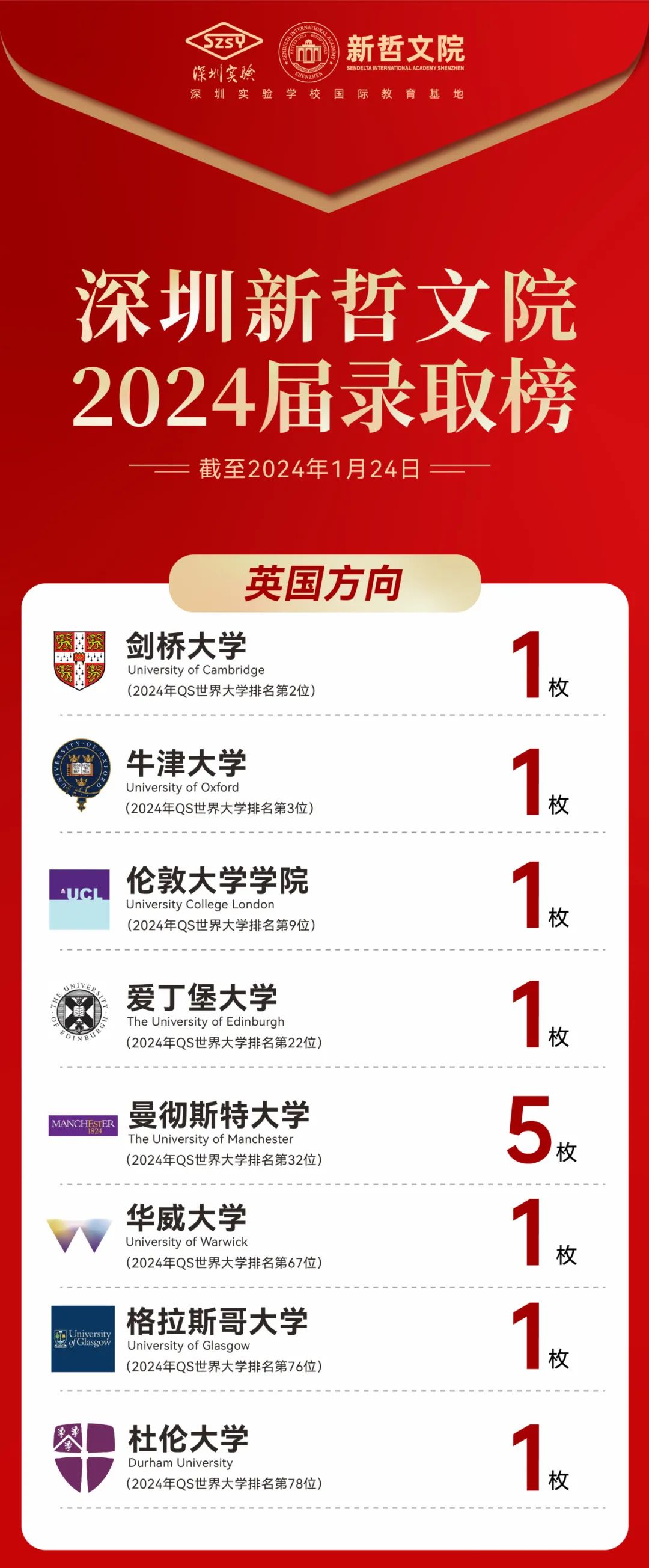 2024届录取季正在进行中,新哲优秀学子已陆续斩获50多封世界名校录取,截至1月24日,收到的英国G5超级精英大学预录取包括牛津大学、剑桥大学、伦敦大学学院。