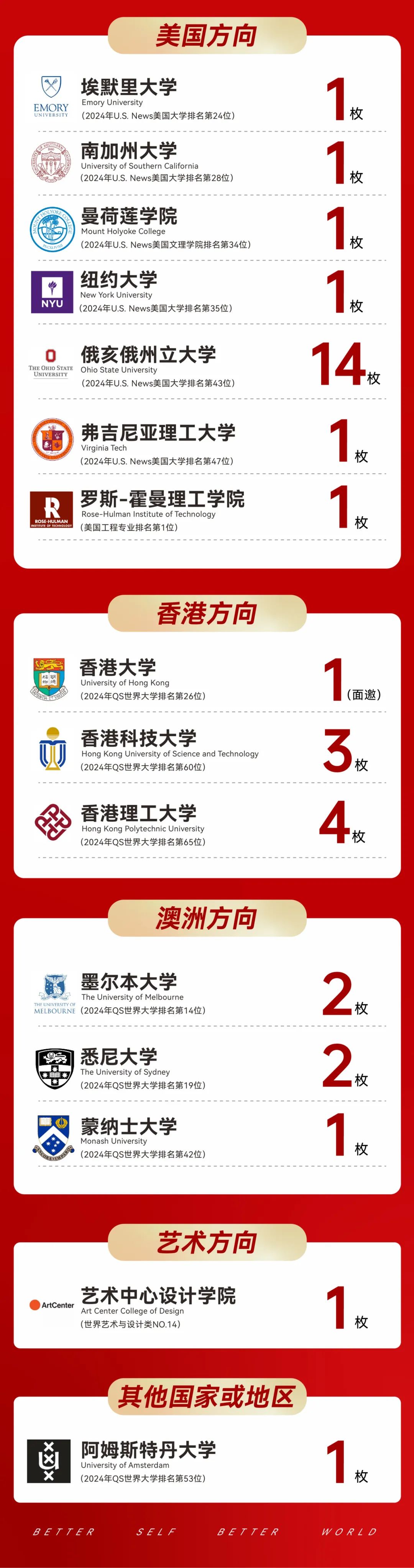 美国方向则斩获埃默里大学、南加州大学、曼荷莲学院、纽约大学、俄亥俄州立大学、弗吉尼亚理工大学、罗斯-霍曼理工学院等多枚无条件录取。