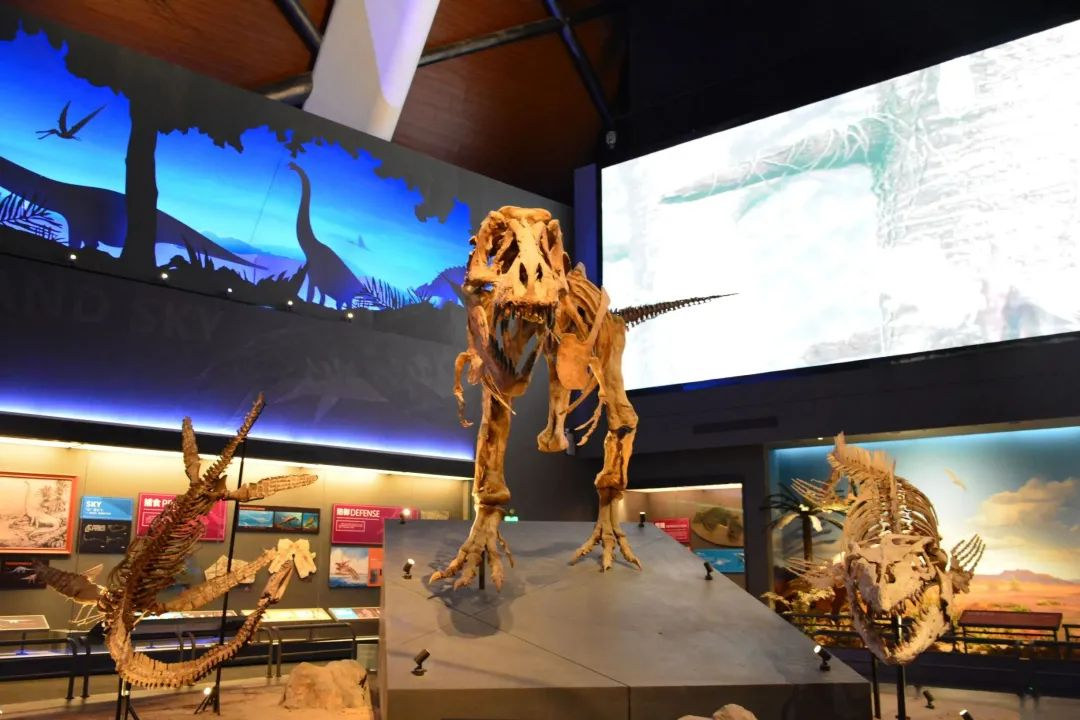 二层“龙的时代”展厅,是让大家最感震惊的,因为一只巨大的霸王龙骨骼雕塑伫立在正中,不禁让大家思考:海洋和恐龙有什么关系呢?